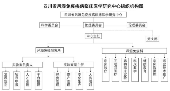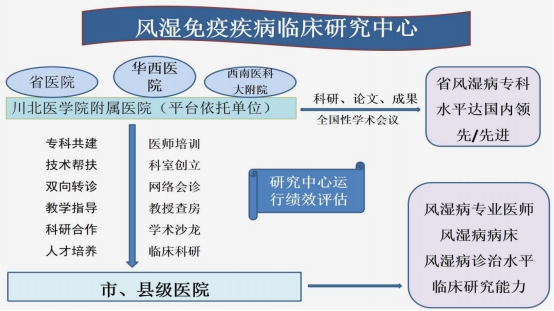 四川省风湿免疫疾病临床医学研究中心依托于川北医学院附属医院进行建设,核心成员包括四川大学华西医院、四川省人民医院、西南医科大学附属医院等28家单位的风湿免疫科,同时形成了由28家医疗机组成的协同创新网络。