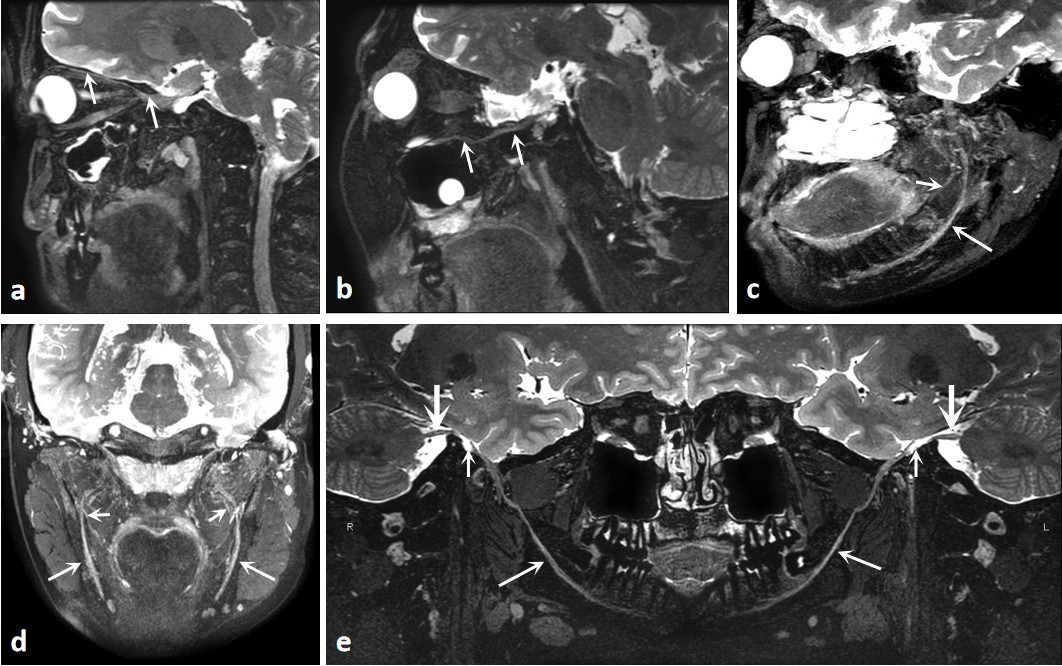 A 3D T2WI-CUBEfs重建图像显示了眼神经(箭头);B 3D T2WI-CUBE fs重建图像显示上颌神经(箭头);C,D 3D T2WI-CUBE fs重建图像显示了下颌神经,下牙槽神经(长箭头)和舌神经(短箭头)的分支;E 3D T2WI-CUBE fs重建图像显示了三叉神经下颌支的完整图像。