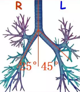 由于右主支气管比左侧更接近于垂直走行,故异物易掉入右侧。
