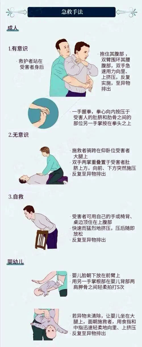 可怕的是,被异物堵住气管、支气管造成窒息,只有5分钟的黄金抢救时间。如果意外不幸发生,只有一个急救方法——海姆立克法。