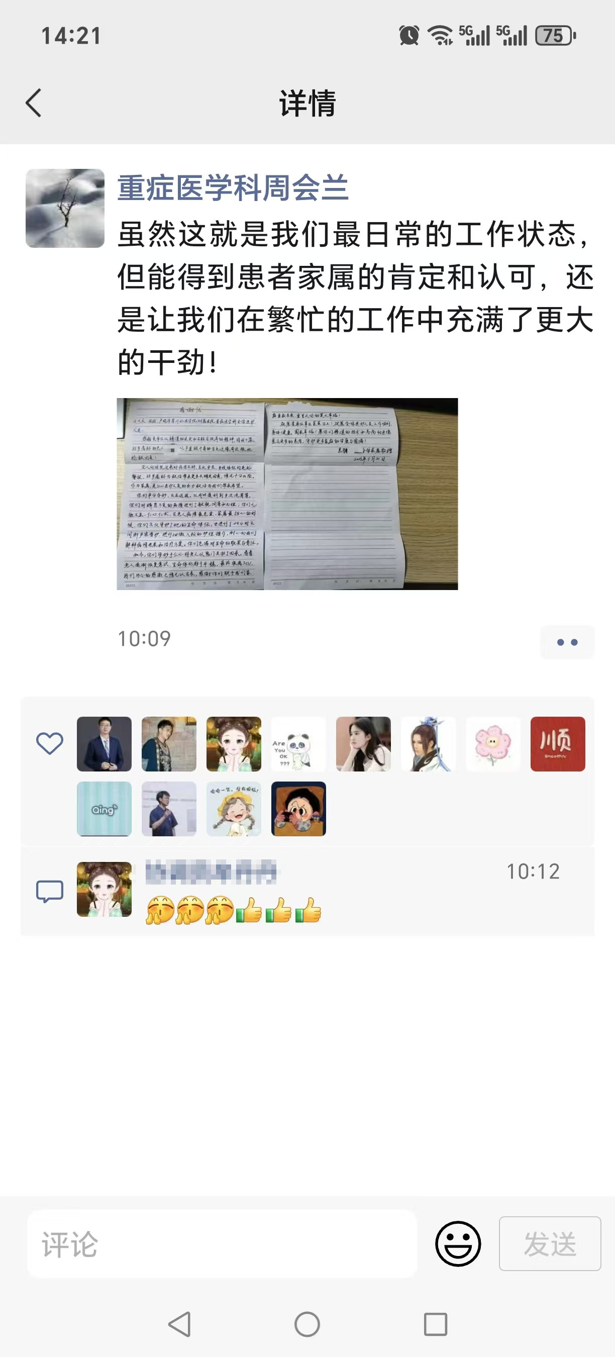 重症医学科护士长周会兰收到的信笺,则承载着一个家庭对生命失而复得的无尽感激。高龄患者命悬一线之际,重症医学科医护团队全力投入,连续实施透析、洗胃等关键救治,以无微不至的照护日夜守候。家属的信中充满感激:“是你们以精湛的医术和不轻言放弃的精神,将我们家88岁高龄老人从严重酸中毒的生死边缘奇迹般地抢救回来!”