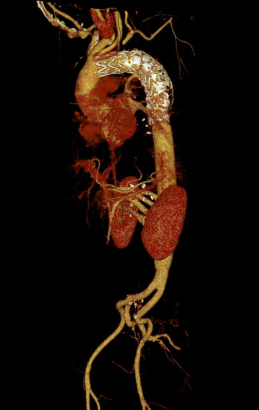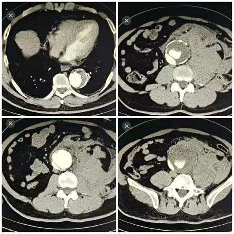 11月15日凌晨1时许,该患者因突发腰背部剧烈疼痛到我院紧急就诊。据了解,该患者10年前曾因胸主动脉夹层接受胸主动脉腔内修复术,院外增强CT检查提示胸腹主动脉瘤,病变最危险部位的血管直径已扩张至7.5cm,且血液正持续从破口渗出,这颗藏于患者体内的“不定时炸弹”一旦彻底破裂,将引发致命性大出血,患者生命危在旦夕。