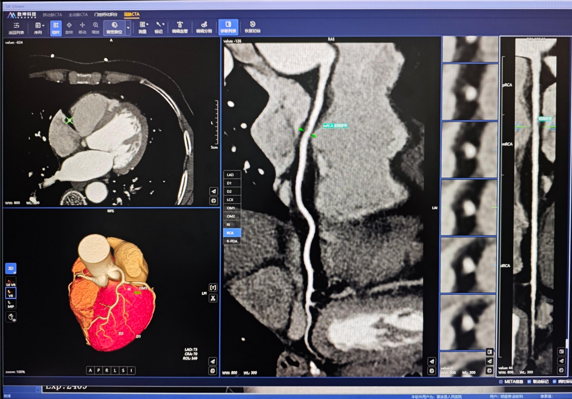 在夏林的精准把控下,团队从心率调控、呼吸屏气训练、造影剂注射方案优化、静脉通道精准选择,到图像重建后处理等全流程细化打磨,最终获取超高清冠状动脉影像资料,为临床精准诊疗提供了坚实依据。该院放射科海来不者老师看到重建图像后激动表示:“这是联影60排螺旋CT(uCT710)装机以来,我们获得的最优质冠脉CTA图像!”