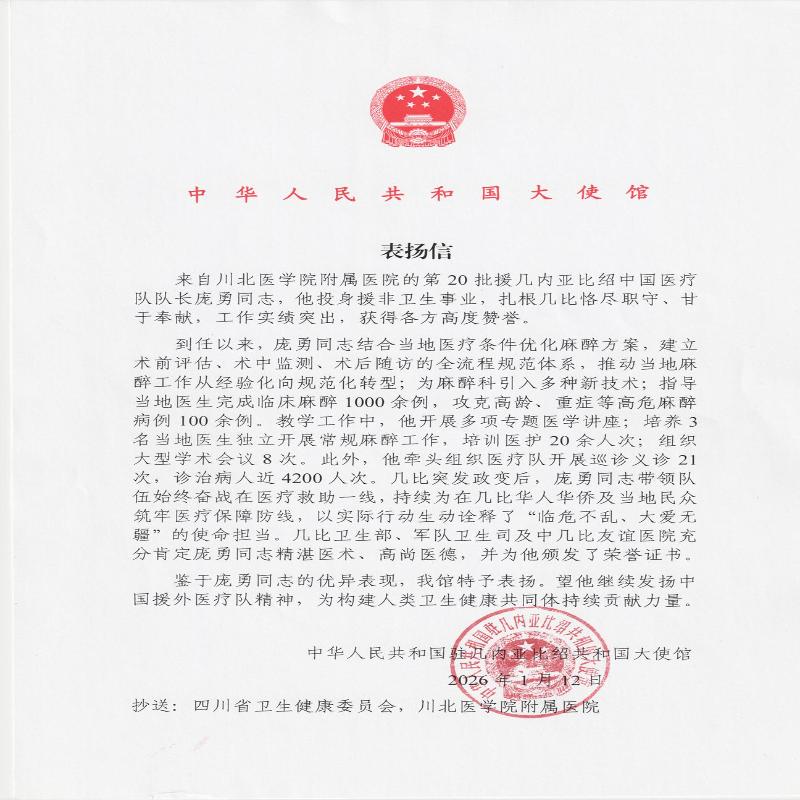 近日,中华人民共和国驻几内亚比绍共和国大使馆向我院发来表扬信,对第20批援几内亚比绍中国医疗队队长庞勇、队员徐建两位同志在援非期间的出色表现给予高度肯定和表彰。他们以精湛医术、高尚医德和无私奉献,在异国他乡践行了中国医者的使命与担当。