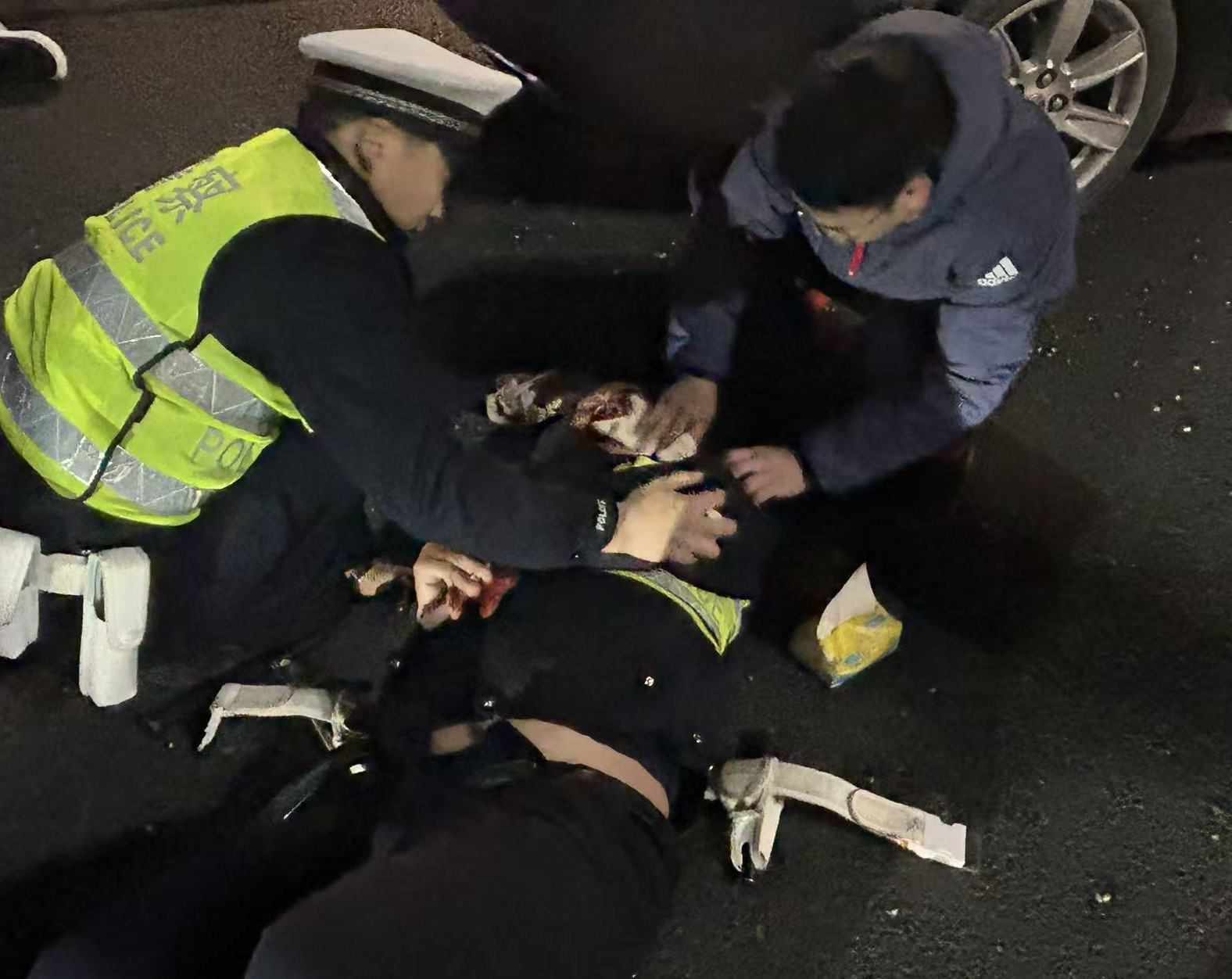 医者的直觉让陈健停下了车。他挤进人群,只见一名交警躺在冰冷的地面上,满脸是血,口腔和鼻腔都在往外渗血。周围同事焦急地呼喊着,都不敢轻易挪动。