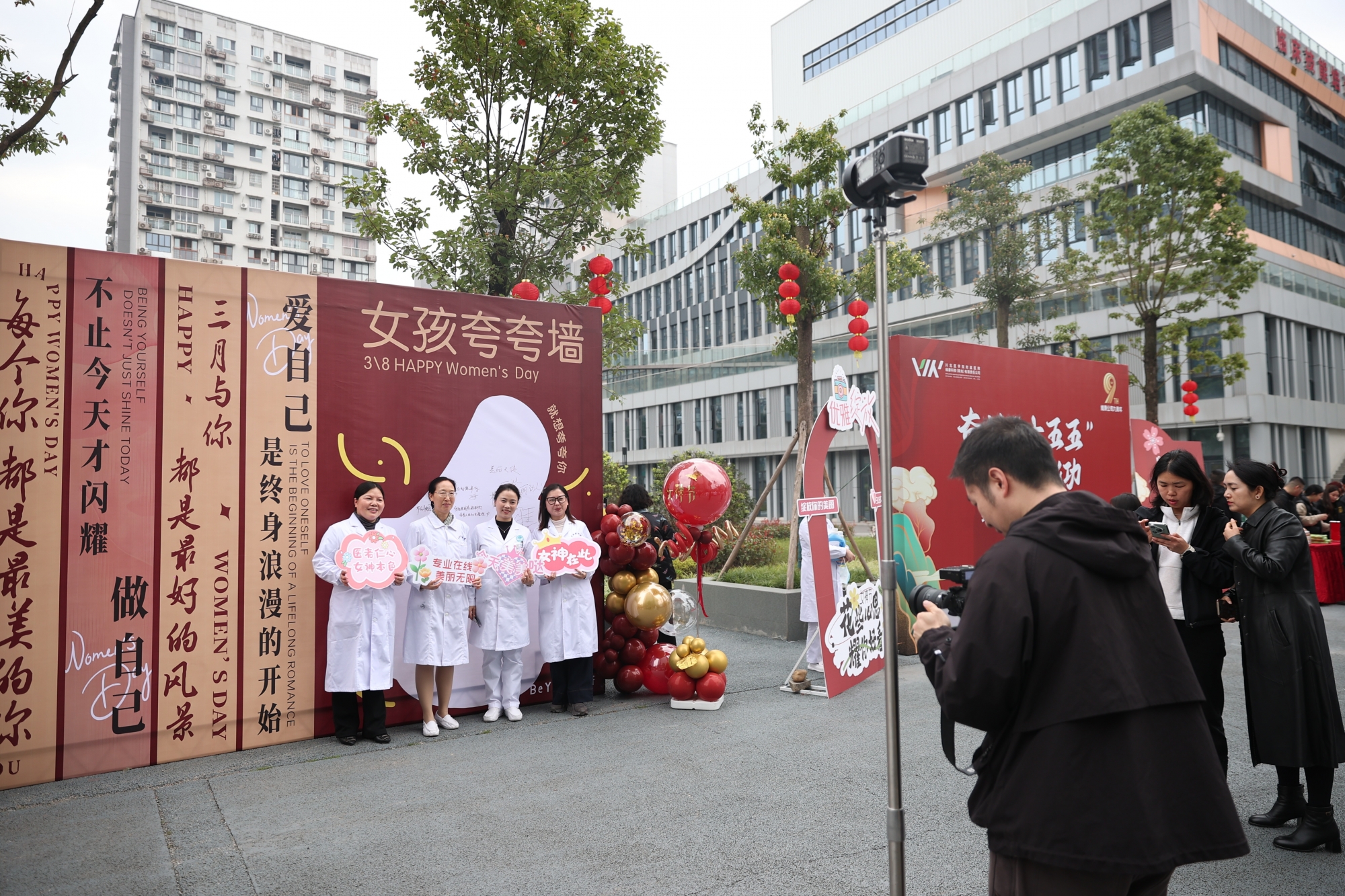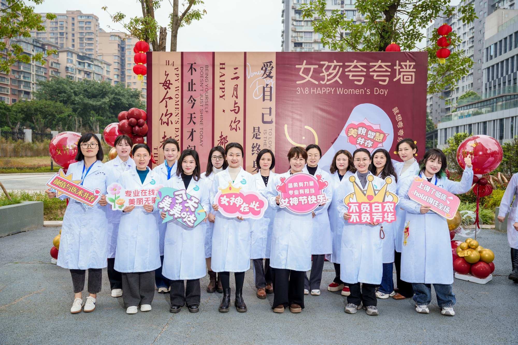 上午九时许,位于医院“厚德门·勤学径”的主题拍照打卡区便洋溢着温馨与喜悦。现场布置雅致而富有仪式感,特邀专业摄影师为平日忙碌于临床一线的女职工们拍摄个人风采照。镜头前,她们或着便装从容优雅,或穿职业装干练自信,卸下白袍的她们,在光影交错间展露出别样的魅力与神采。女职工们手持创意标语牌,在镜头中留下属于这个节日的动人瞬间,定格下属于“她力量”的温暖与光芒。