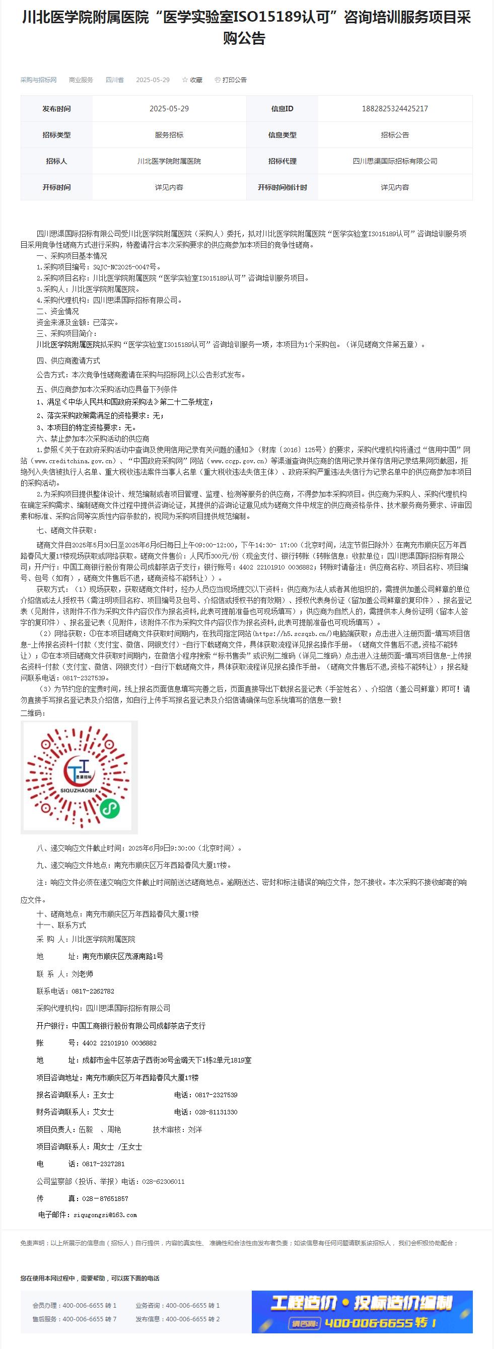 根据《中华人民共和国招标投标法》及医院招标采购制度相关规定,现将我院川北医学院附属医院“医学实验室ISO15189认可”咨询培训服务项目采购公告如下。也可登录中国采购与招标网(网址:http://www.chinabidding.cn/sa/sichuan/)查询详情。