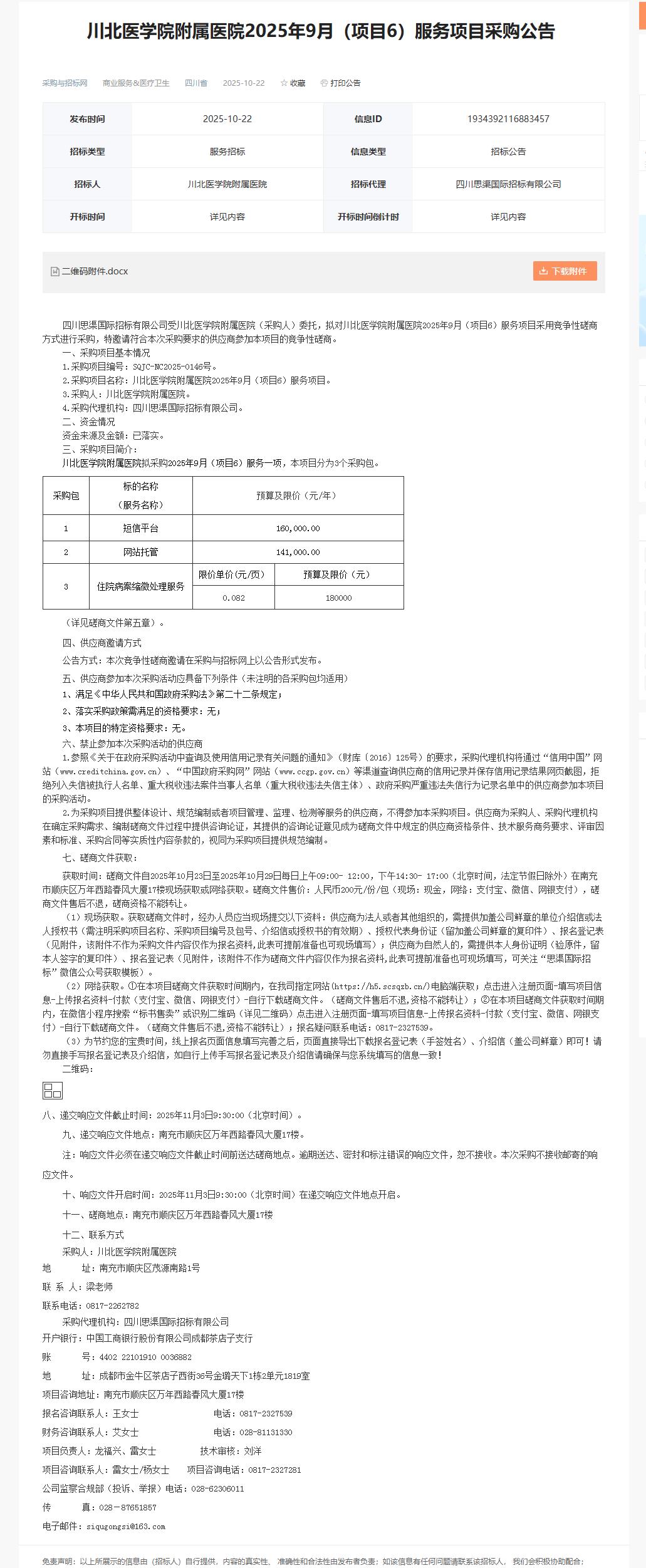 根据《中华人民共和国招标投标法》、《中华人民共和国政府采购法》及医院招标采购制度相关规定,现将我院2025年9月(项目6)服务项目采购项目采购公告如下。也可登录中国采购与招标网(网址:http://www.chinabidding.cn/sa/sichuan/)查询详情。