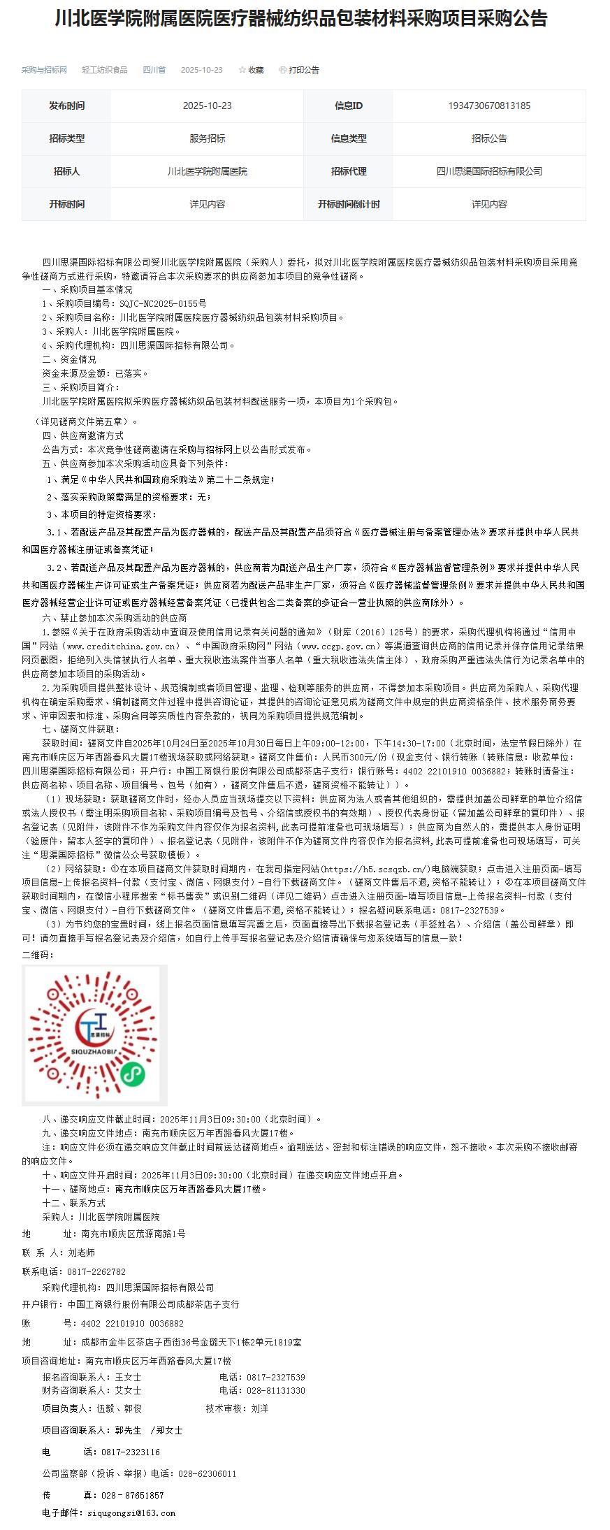 根据《中华人民共和国招标投标法》及医院招标采购制度相关规定,现将我院川北医学院附属医院医疗器械纺织品包装材料采购项目采购公告如下。也可登录中国采购与招标网(网址:http://www.chinabidding.cn/sa/sichuan/)查询详情。