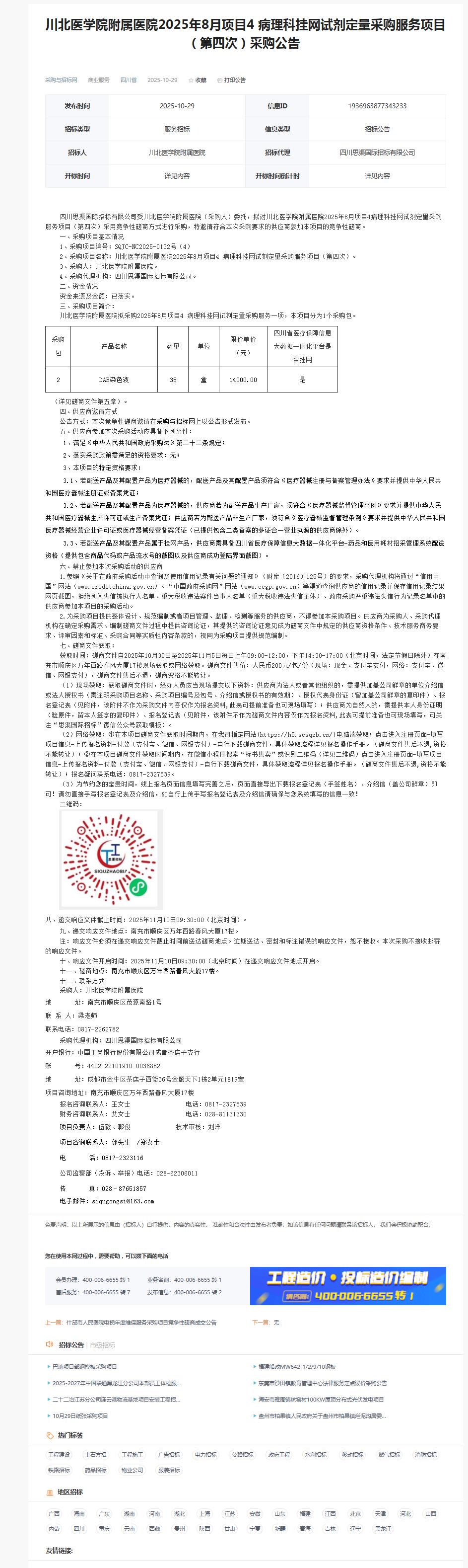 根据《中华人民共和国招标投标法》、《中华人民共和国政府采购法》及医院招标采购制度相关规定,现将我院2025年8月项目4病理科挂网试剂定量采购服务项目(第四次)采购公告如下。也可登录中国采购与招标网(网址:http://www.chinabidding.cn/sa/sichuan/)查询详情。