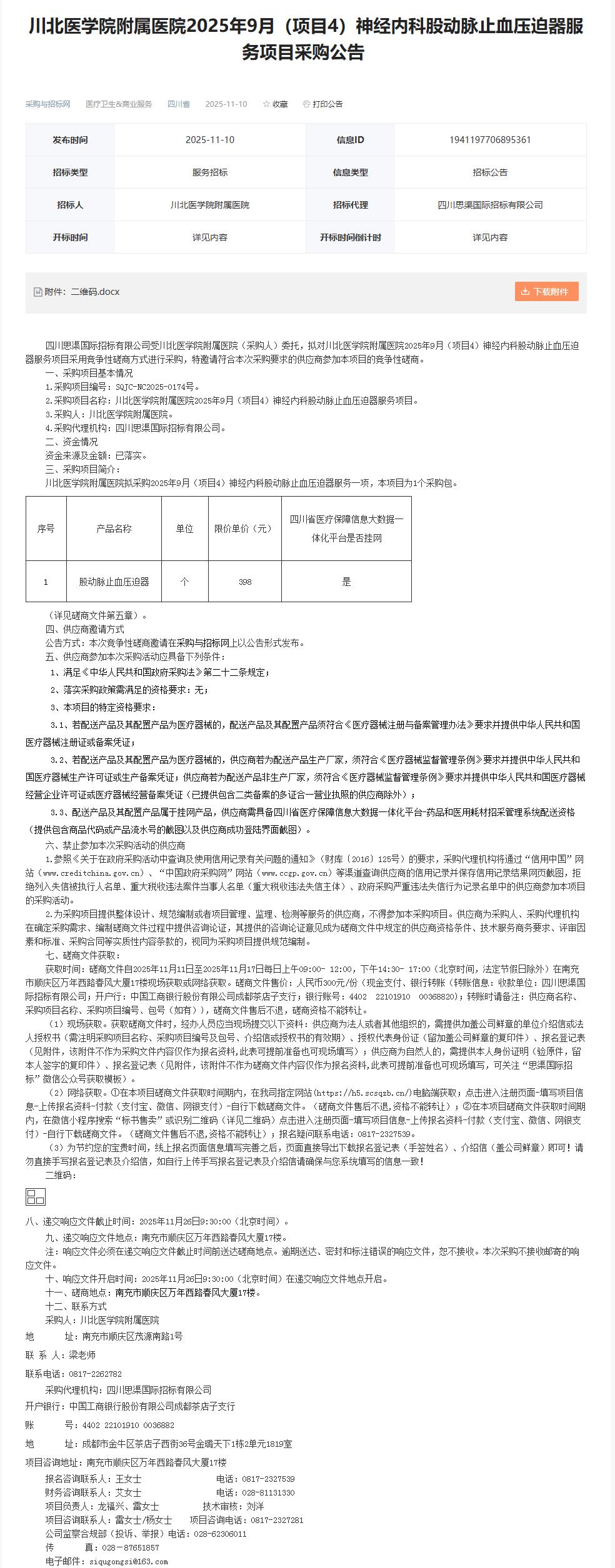 根据《中华人民共和国招标投标法》、《中华人民共和国政府采购法》及医院招标采购制度相关规定,现将我院2025年9月(项目4) 神经内科股动脉止血压迫器服务项目采购公告如下。也可登录中国采购与招标网(网址:http://www.chinabidding.cn/sa/sichuan/)查询详情。