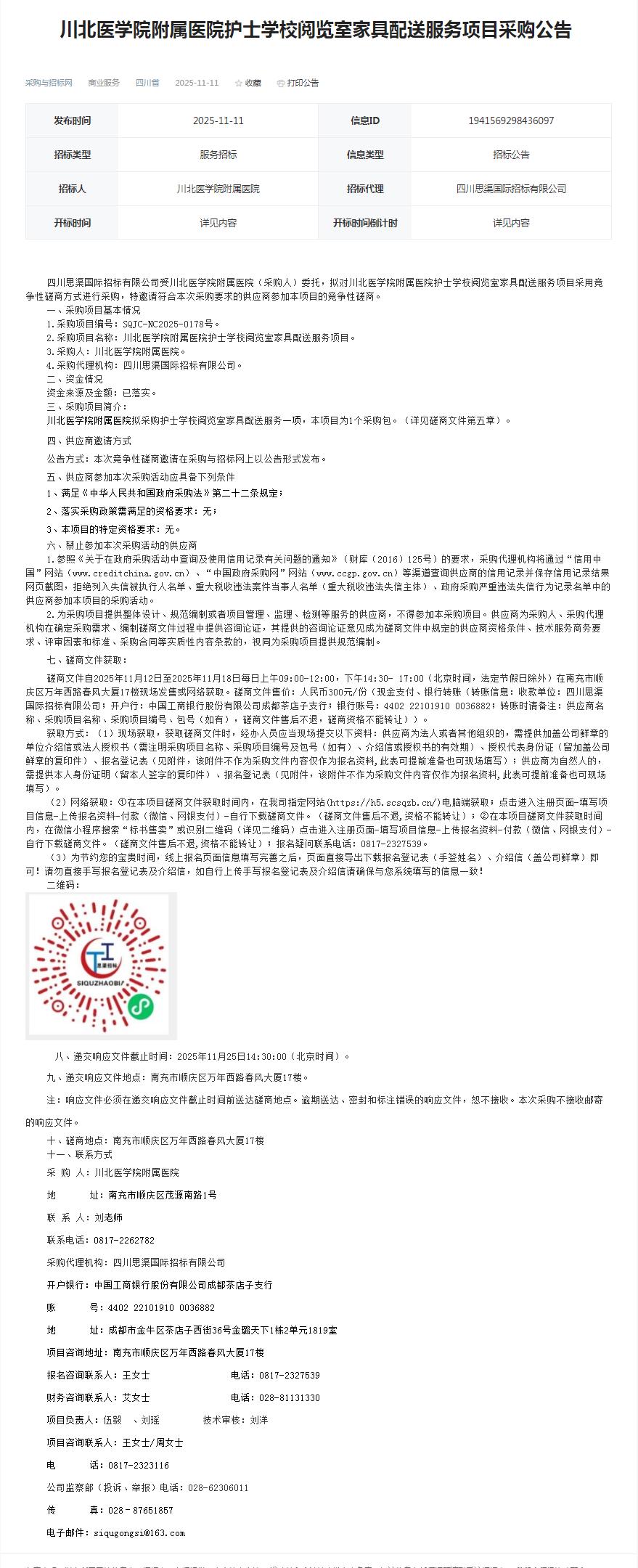 根据《中华人民共和国招标投标法》及医院招标采购制度相关规定,现将我院川北医学院附属医院护士学校阅览室家具配送服务项目采购公告如下。也可登录中国采购与招标网(网址:http://www.chinabidding.cn/sa/sichuan/)查询详情。