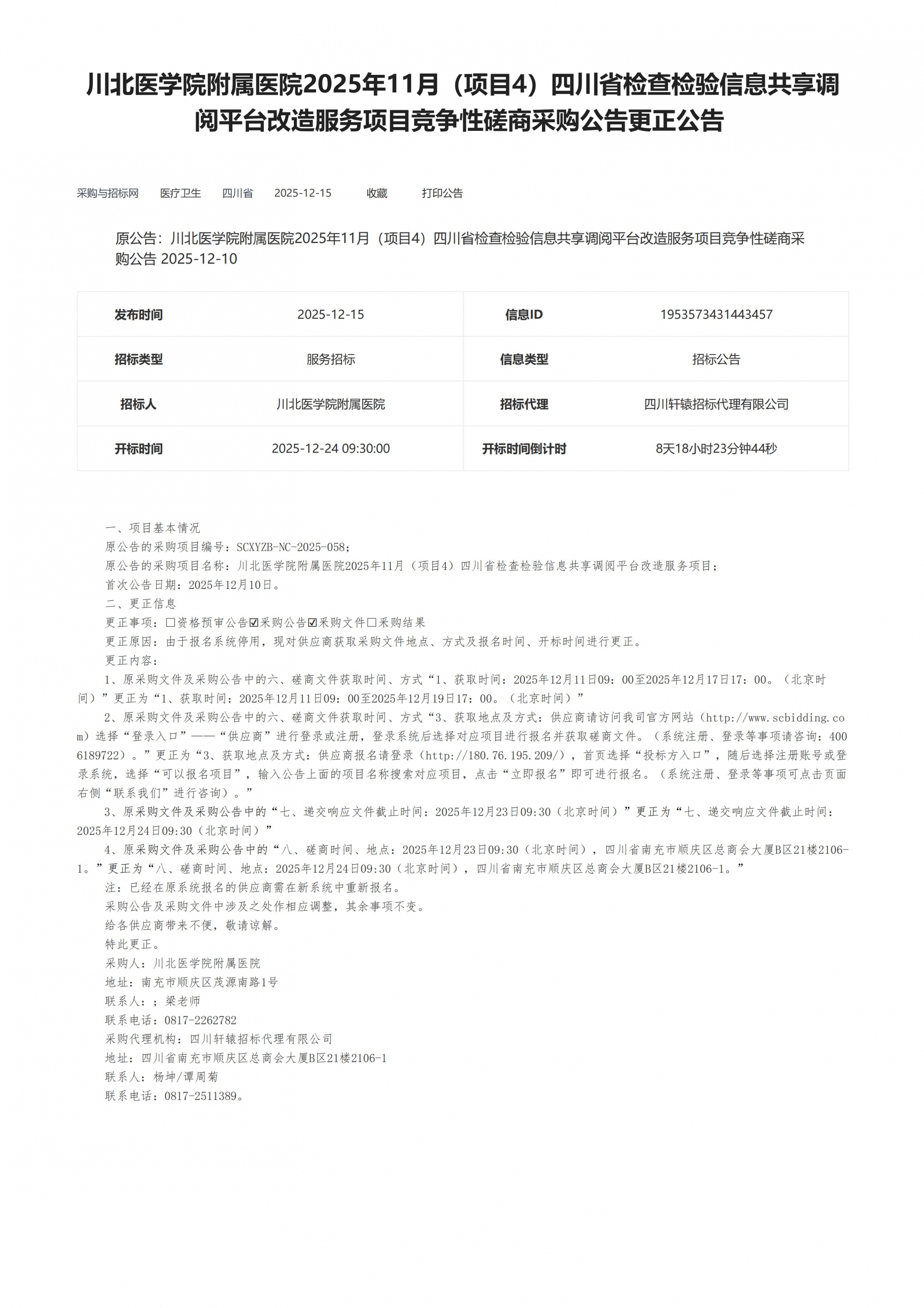 根据《中华人民共和国招标投标法》、《中华人民共和国政府采购法》及医院招标采购制度相关规定,现将我院2025年11月(项目4)四川省检查检验信息共享调阅平台改造服务项目更正公告如下。也可登录中国采购与招标网(网址:http://www.chinabidding.cn/sa/sichuan/)查询详情