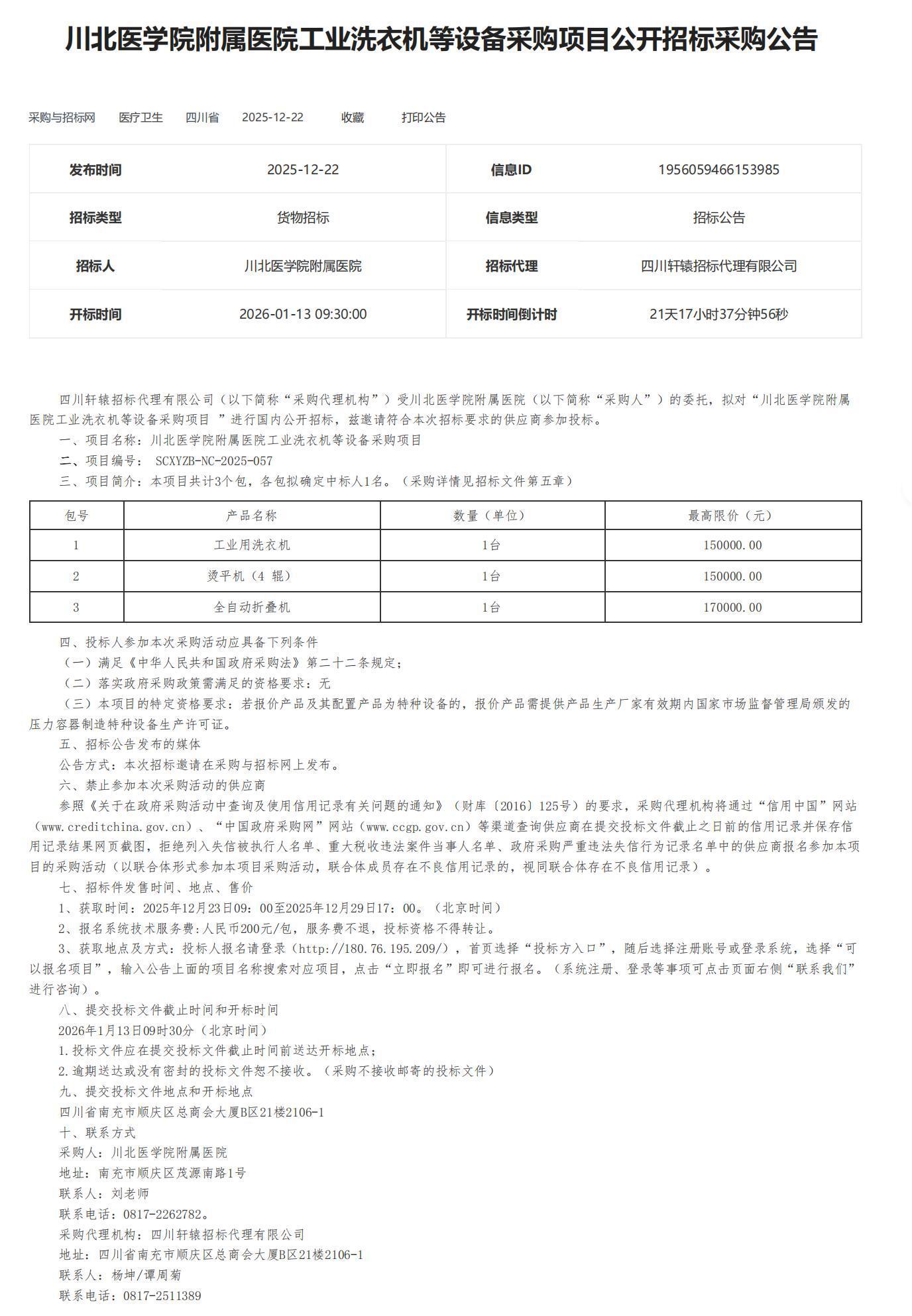川北医学院附属医院工业洗衣机等设备采购项目公开招标采购公告