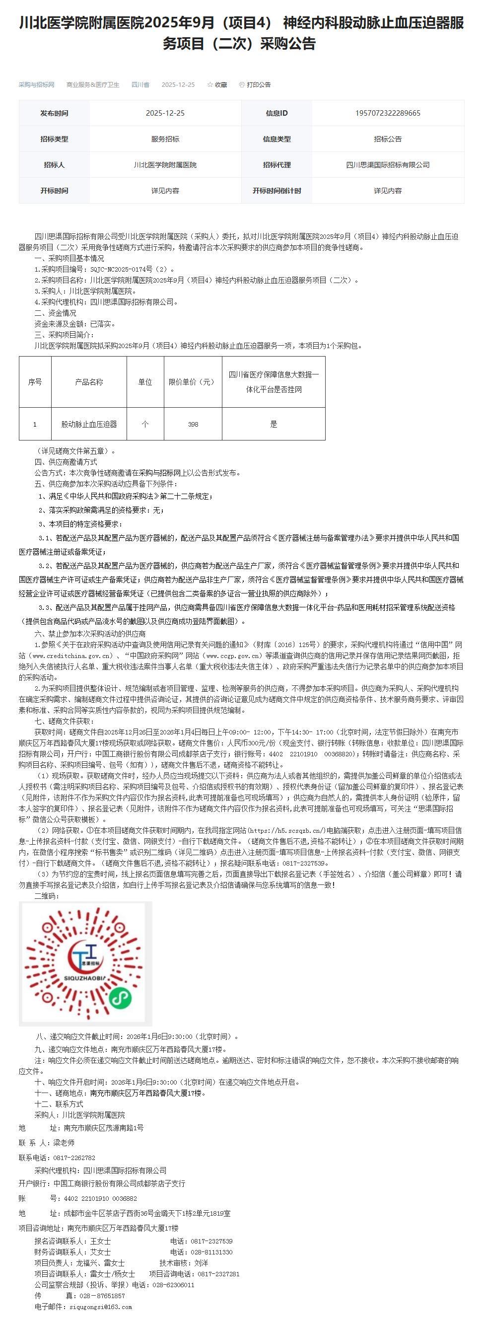 根据《中华人民共和国招标投标法》、《中华人民共和国政府采购法》及医院招标采购制度相关规定,现将我院2025年9月(项目4)神经内科股动脉止血压迫器服务项目(二次)采购公告如下。也可登录中国采购与招标网(网址:http://www.chinabidding.cn/sa/sichuan/)查询详情