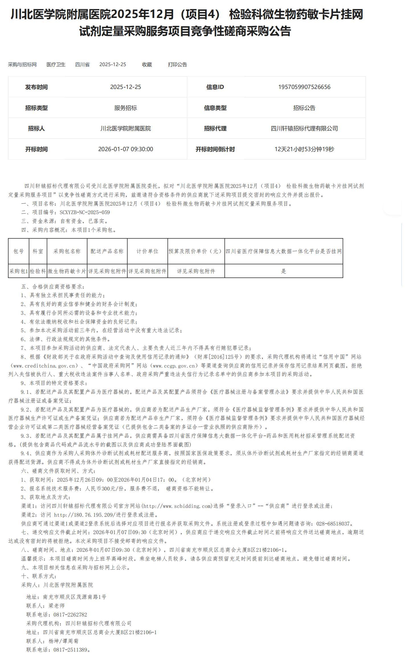 【磋商】川北医学院附属医院2025年12月(项目4)检验科微生物药敏卡片挂网试剂定量采购服务项目竞争性磋商采购公告