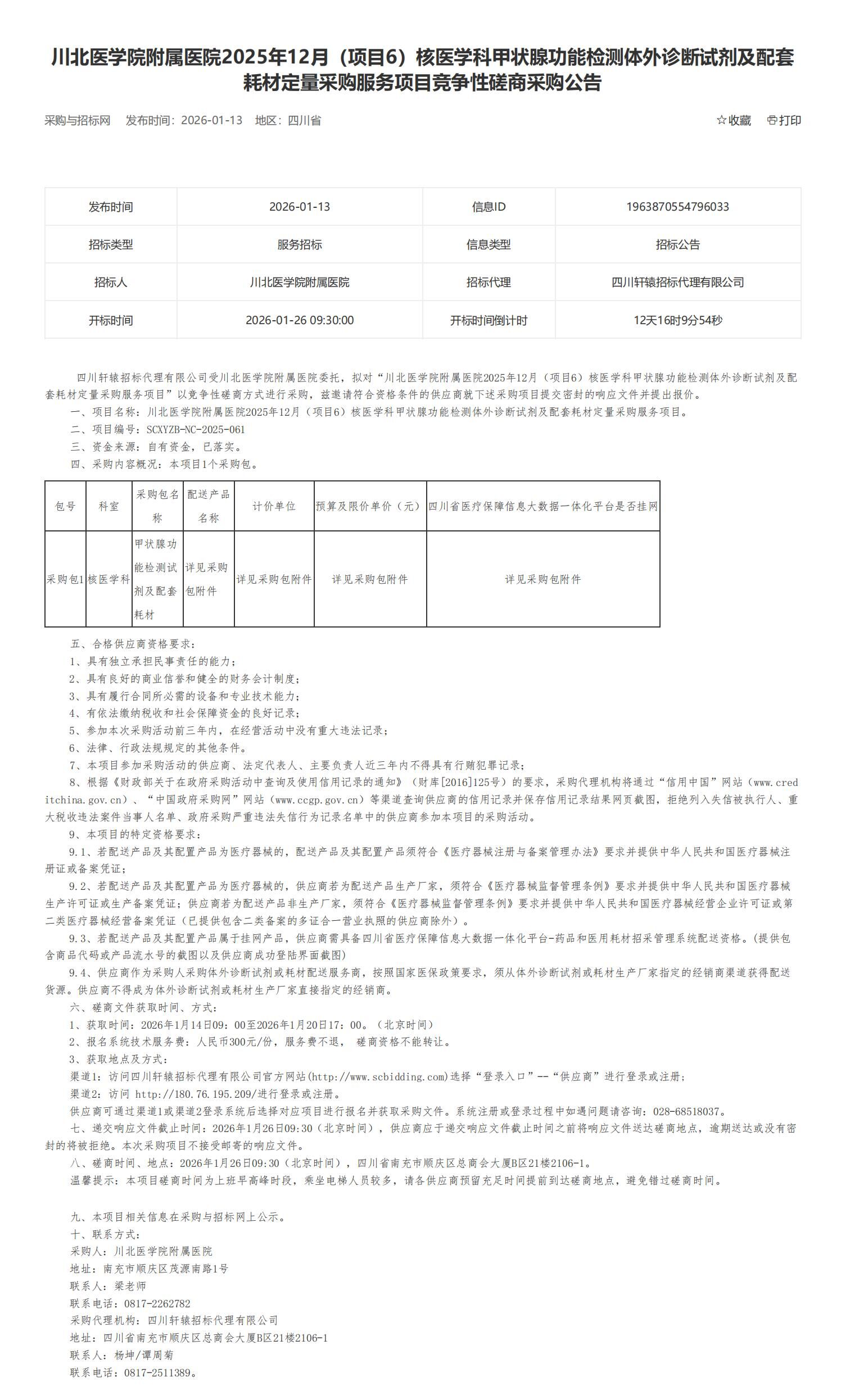 川北医学院附属医院2025年12月(项目6)核医学科甲状腺功能检测体外诊断试剂及配套耗材定量采购服务项目竞争性磋商采购公告