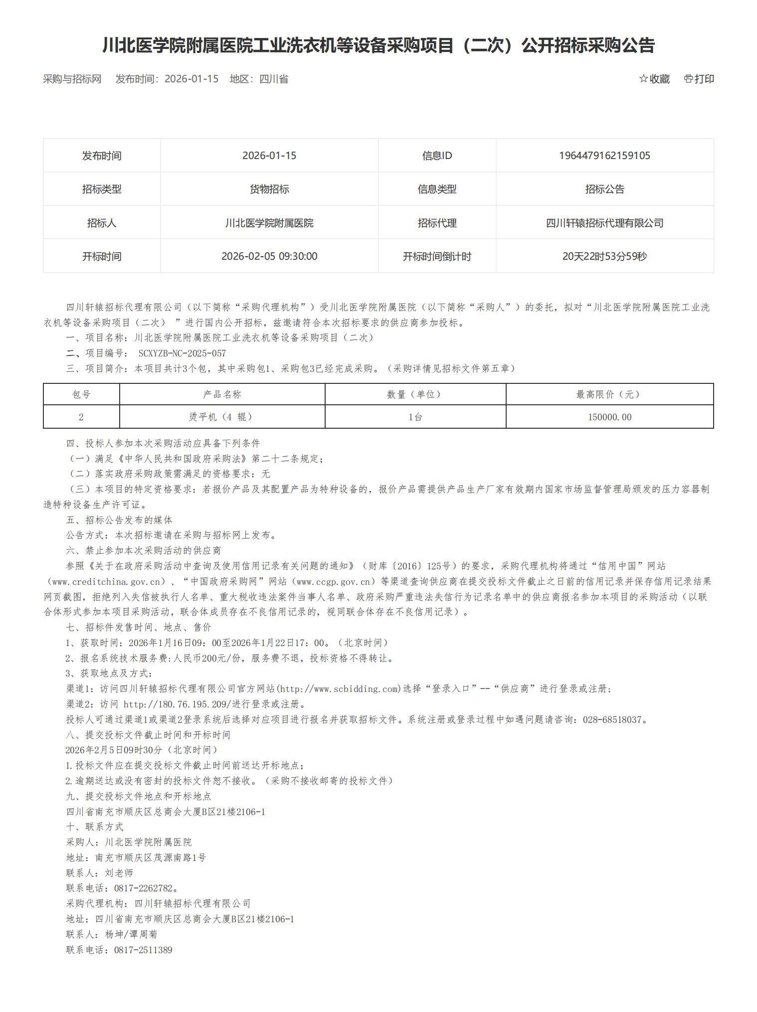 川北医学院附属医院工业洗衣机等设备采购项目(二次)公开招标采购公告