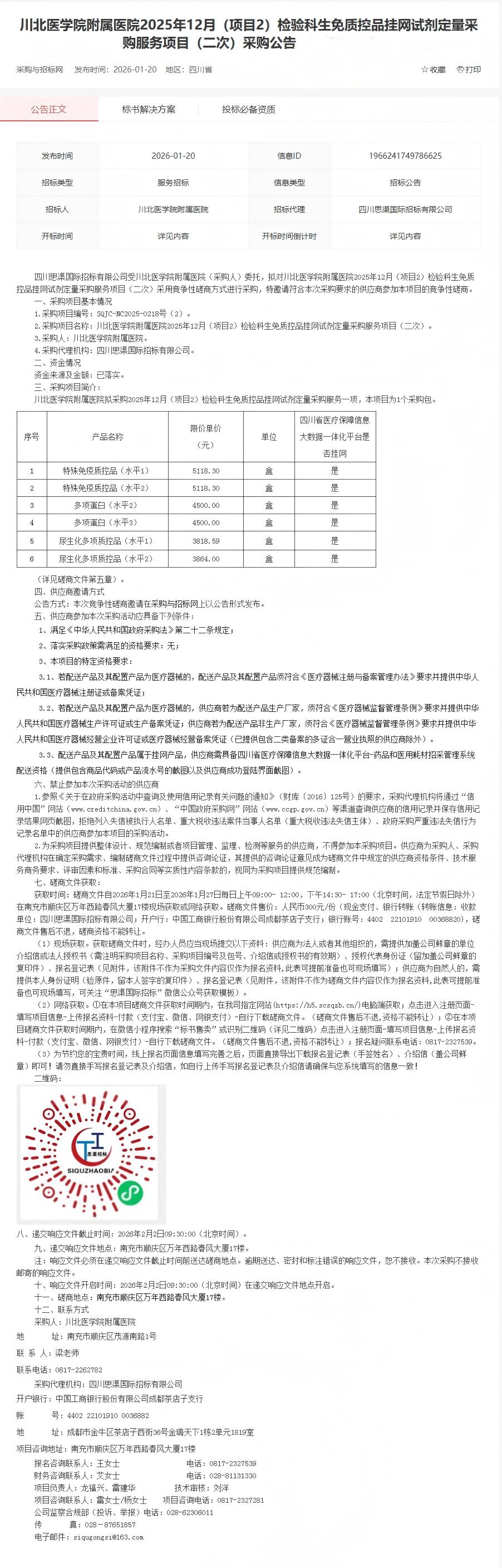 根据《中华人民共和国招标投标法》、《中华人民共和国政府采购法》及医院招标采购制度相关规定,现将我院2025年12月(项目2)检验科生免质控品挂网试剂定量采购服务项目(第二次)采购公告如下。也可登录中国采购与招标网(网址:http://www.chinabidding.cn/sa/sichuan/)查询详情。