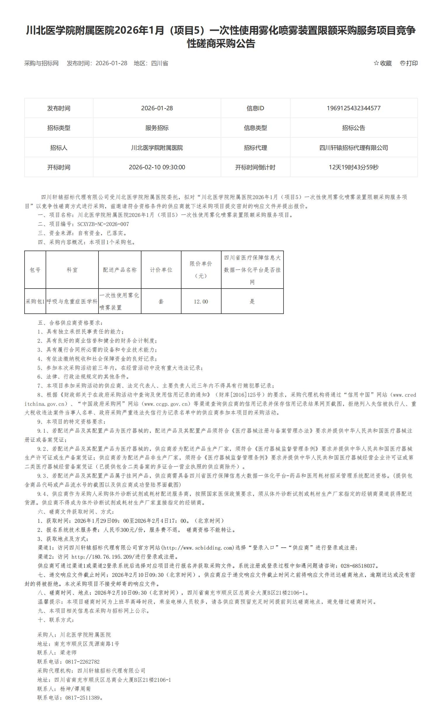 根据《中华人民共和国招标投标法》、《中华人民共和国政府采购法》及医院招标采购制度相关规定,现将我院川北医学院附属医院2026年1月(项目5)一次性使用雾化喷雾装置限额采购服务项目竞争性磋商采购公告如下。也可登录中国采购与招标网(网址:http://www.chinabidding.cn/sa/sichuan/)查询详情。
