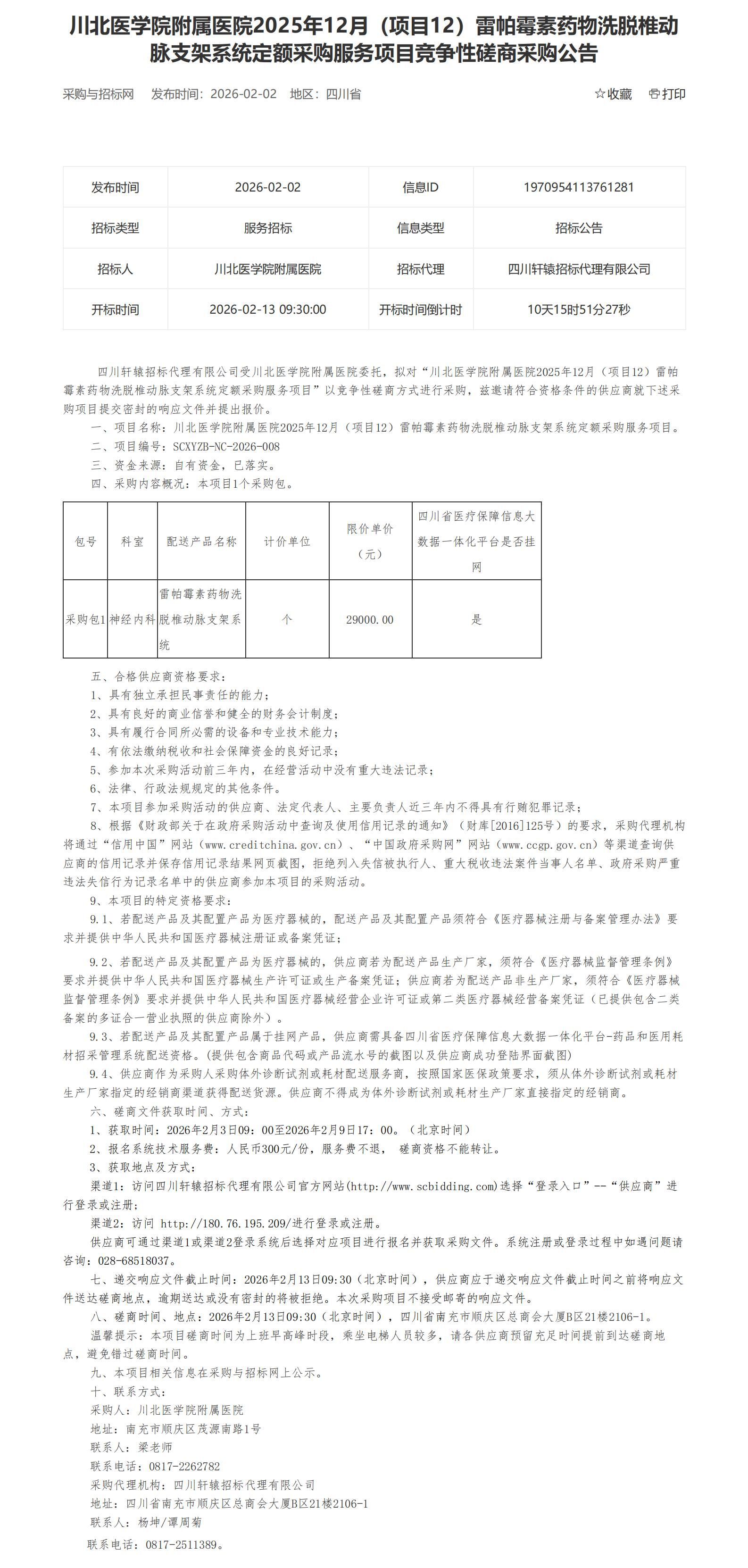【磋商】2025年12月(项目12)雷帕霉素药物洗脱椎动脉支架系统定额采购服务项目竞争性磋商采购公告