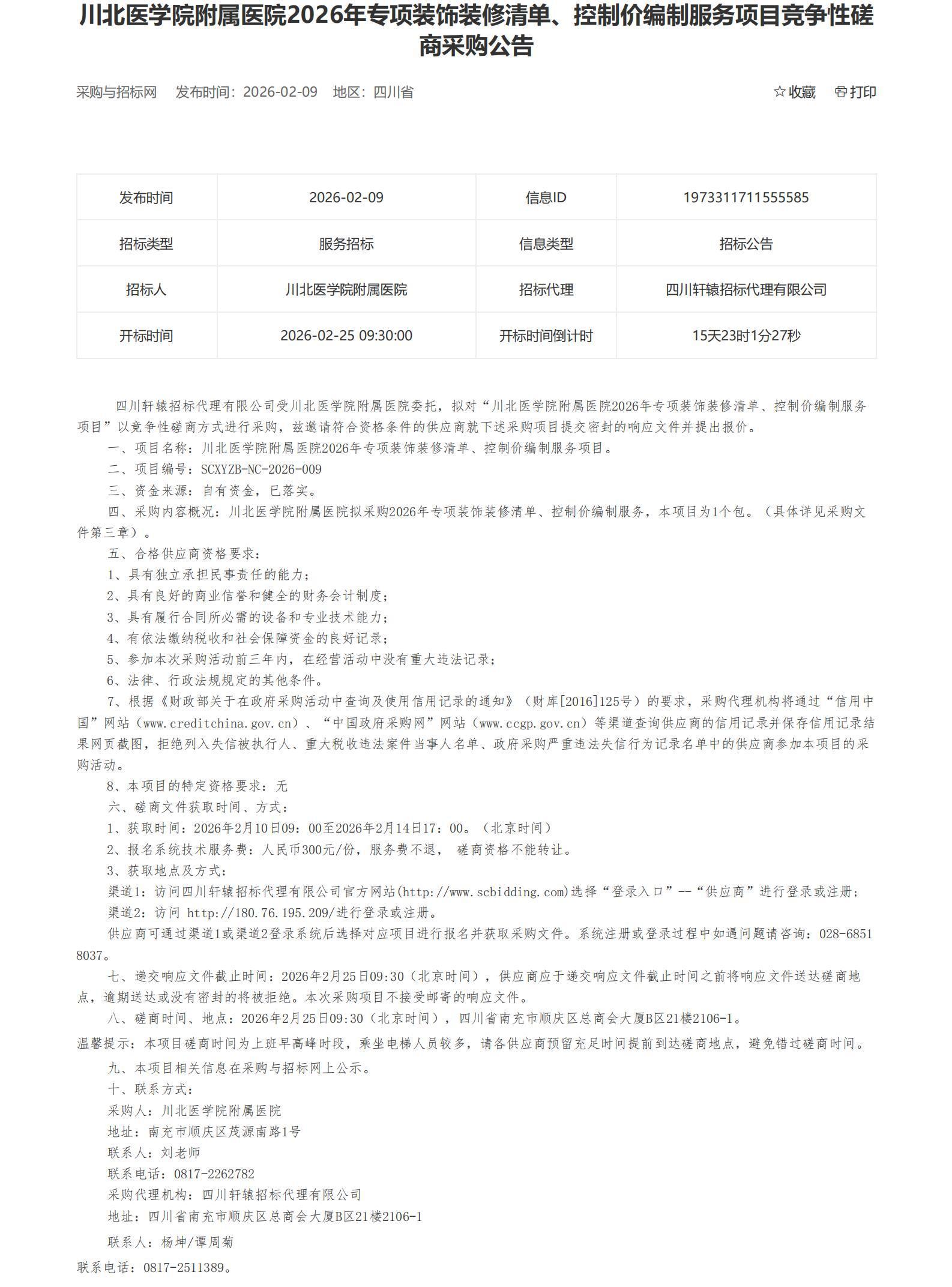 川北医学院附属医院2026年专项装饰装修清单、控制价编制服务项目竞争性磋商采购公告