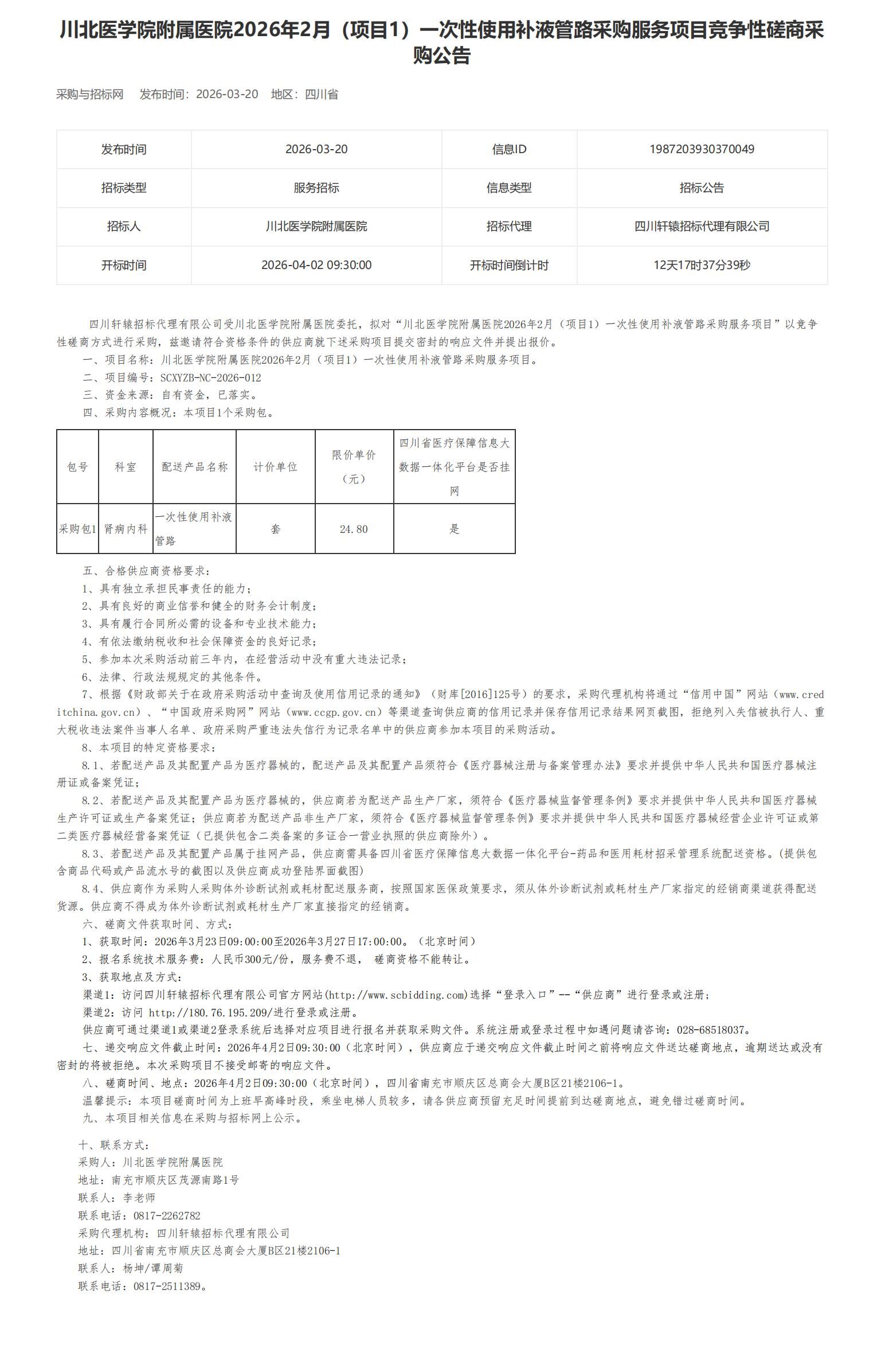 川北医学院附属医院2026年2月(项目1)一次性使用补液管路采购服务项目竞争性磋商采购公告