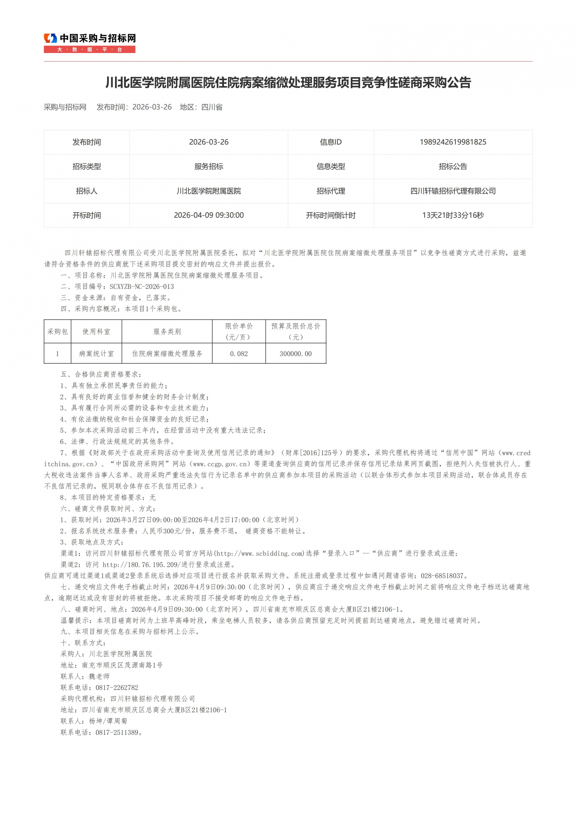 川北医学院附属医院住院病案微缩处理服务项目竞争性磋商采购公告