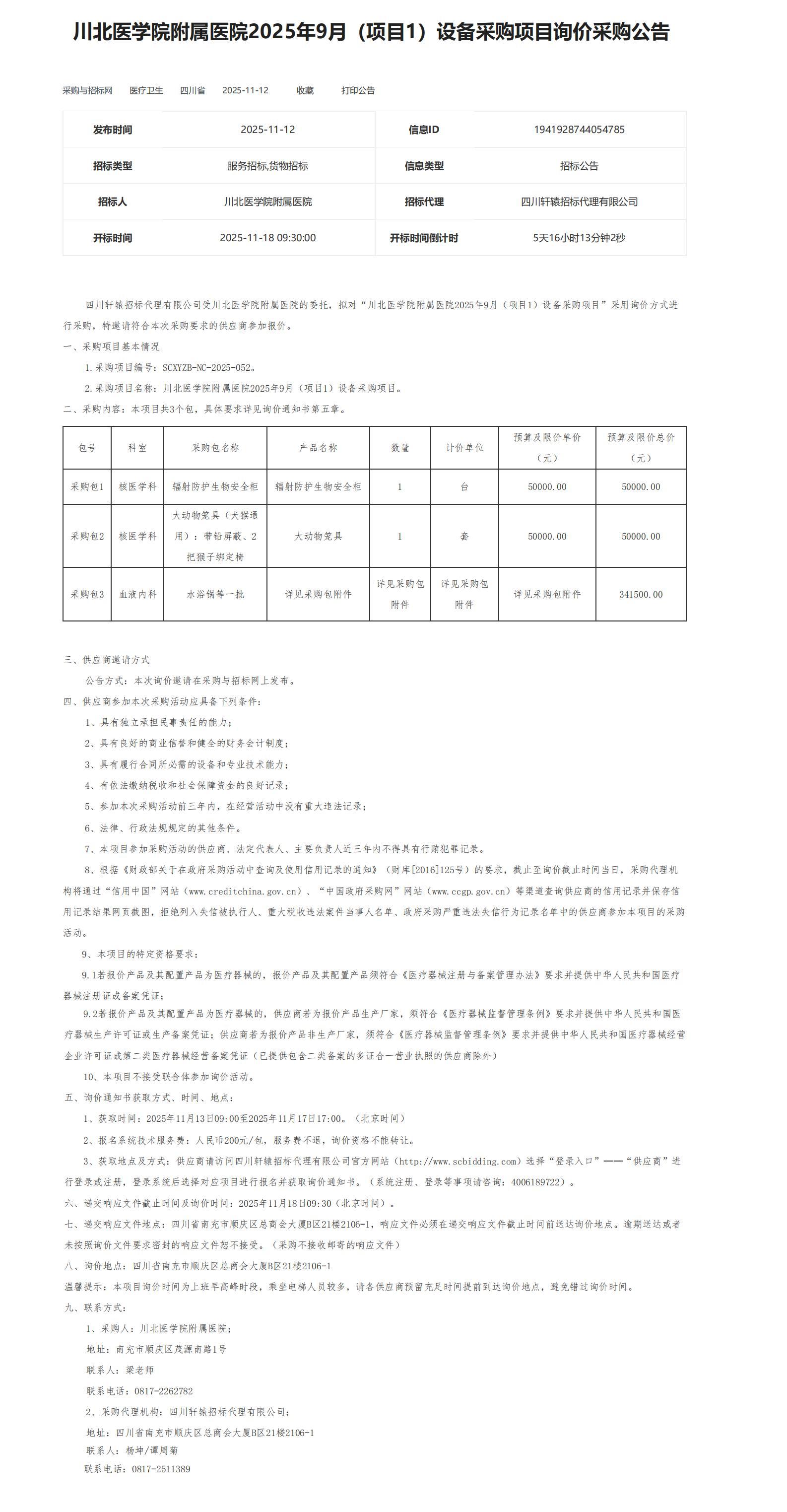 【询价】川北医学院附属医院2025年9月(项目1)设备采购项目采购公告