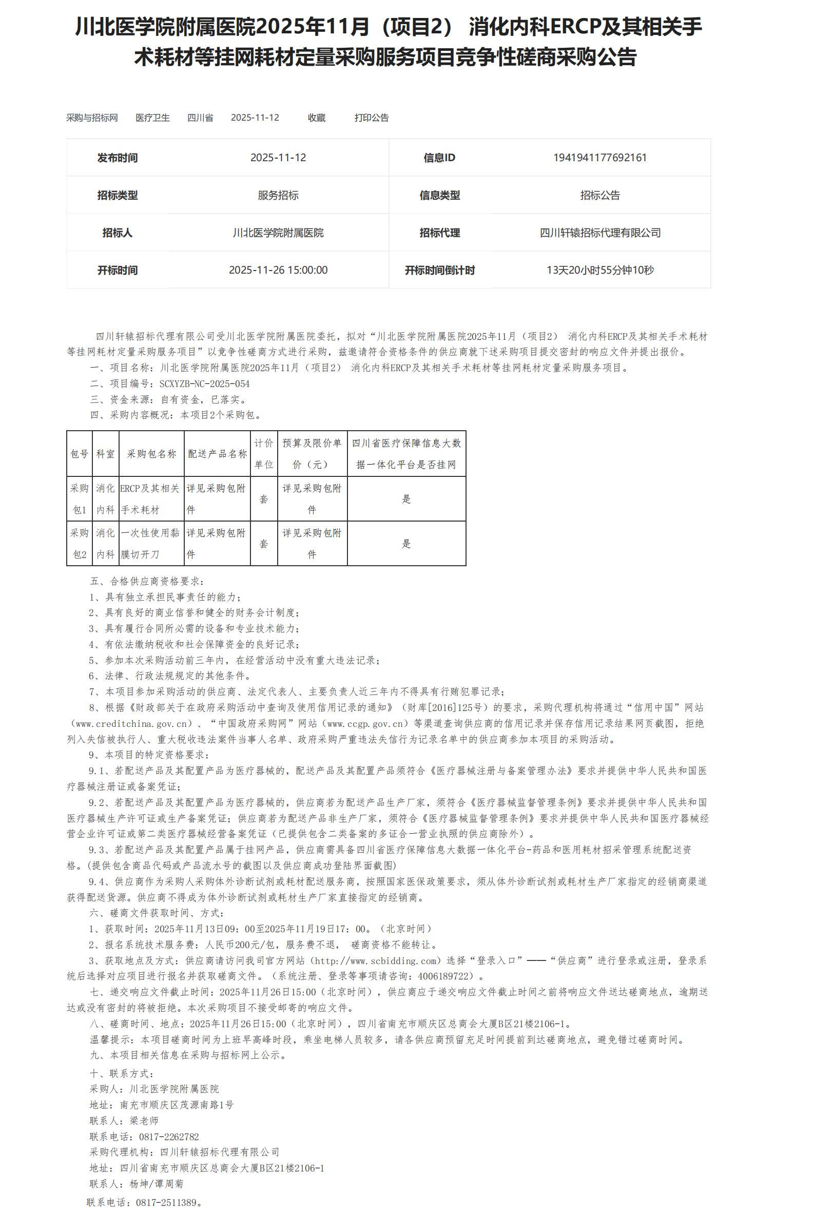 【磋商】川北医学院附属医院2025年11月(项目2) 消化内科ERCP及其相关手术耗材等挂网耗材定量采购服务项目采购公告