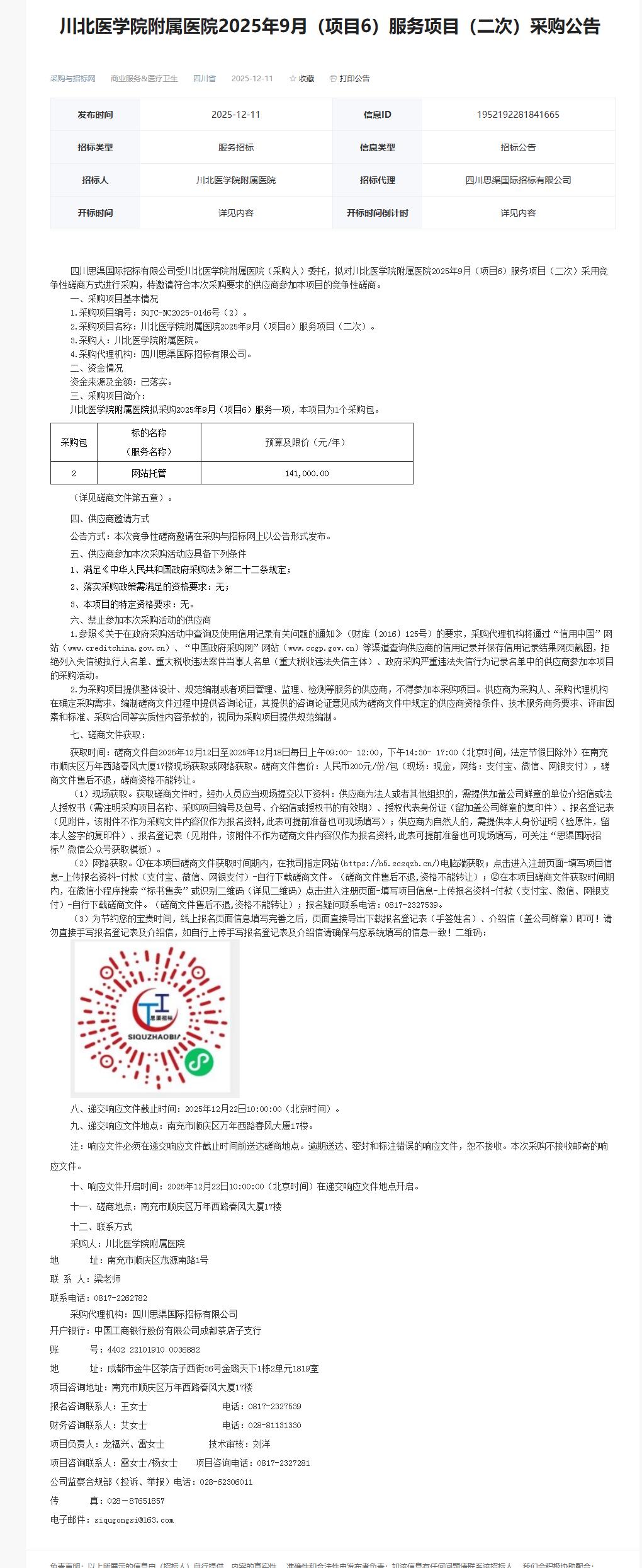 根据《中华人民共和国招标投标法》及医院招标采购制度相关规定,现将我院川北医学院附属医院2025年9月(项目6)服务项目(二次)公告如下。也可登录中国采购与招标网(网址:http://www.chinabidding.cn/sa/sichuan/)