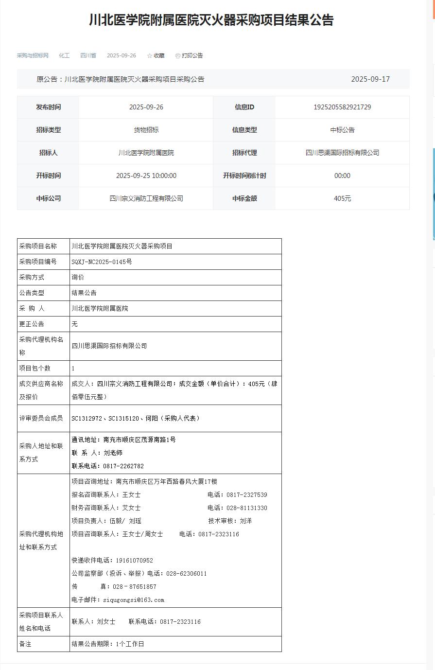 根据《中华人民共和国招标投标法》及医院招标采购制度相关规定,现将我院川北医学院附属医院灭火器采购项目结果公告如下。也可登录中国采购与招标网(网址:http://www.chinabidding.cn/sa/sichuan/)查询详情。