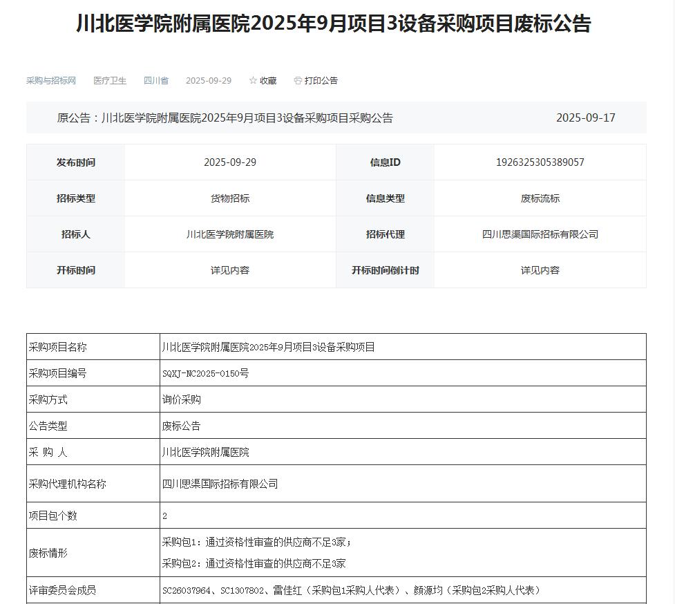 川北医学院附属医院2025年9月项目3设备采购项目废标公告