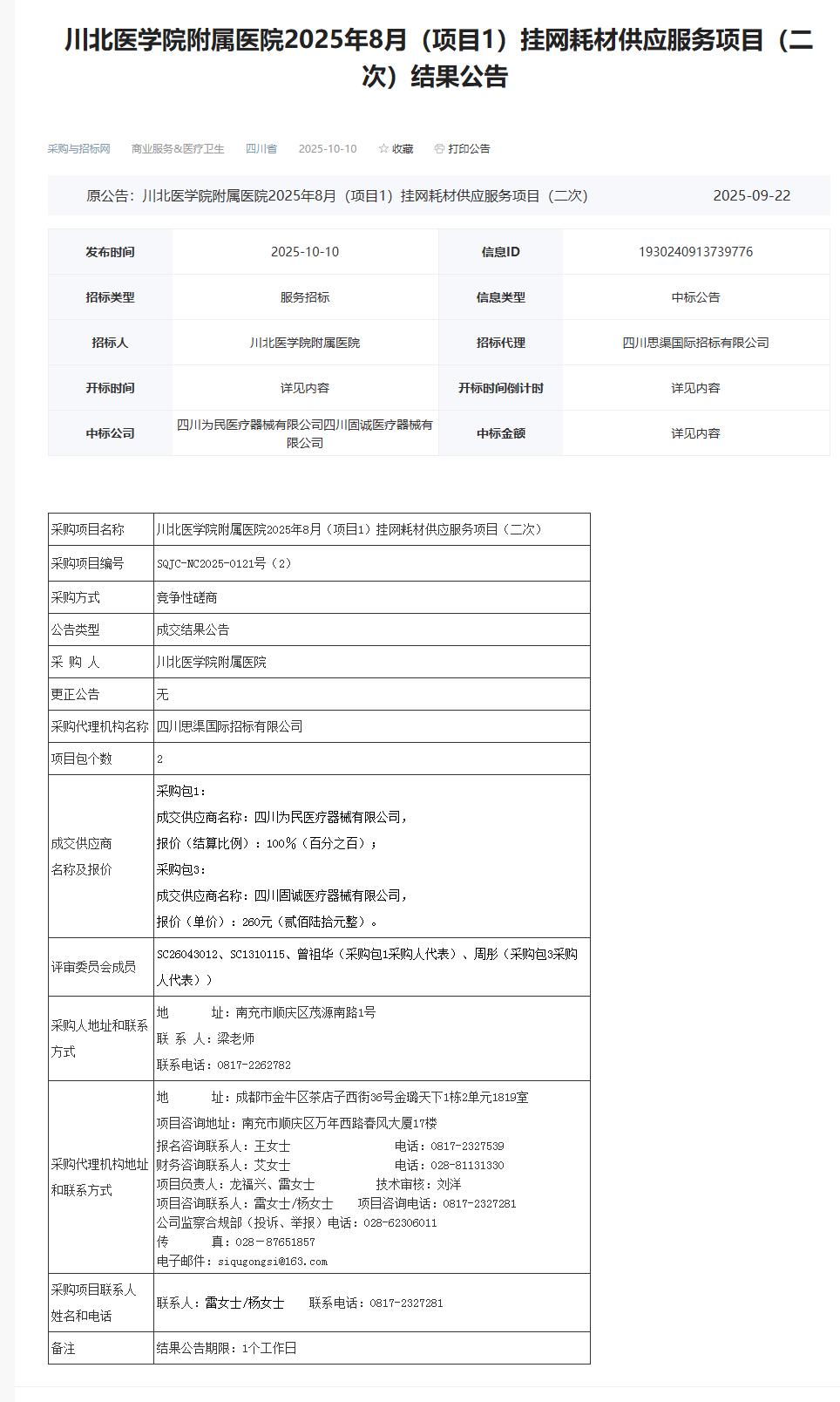 【结果】川北医学院附属医院2025年8月(项目1)挂网耗材供应服务项目(第二次)采购结果公告