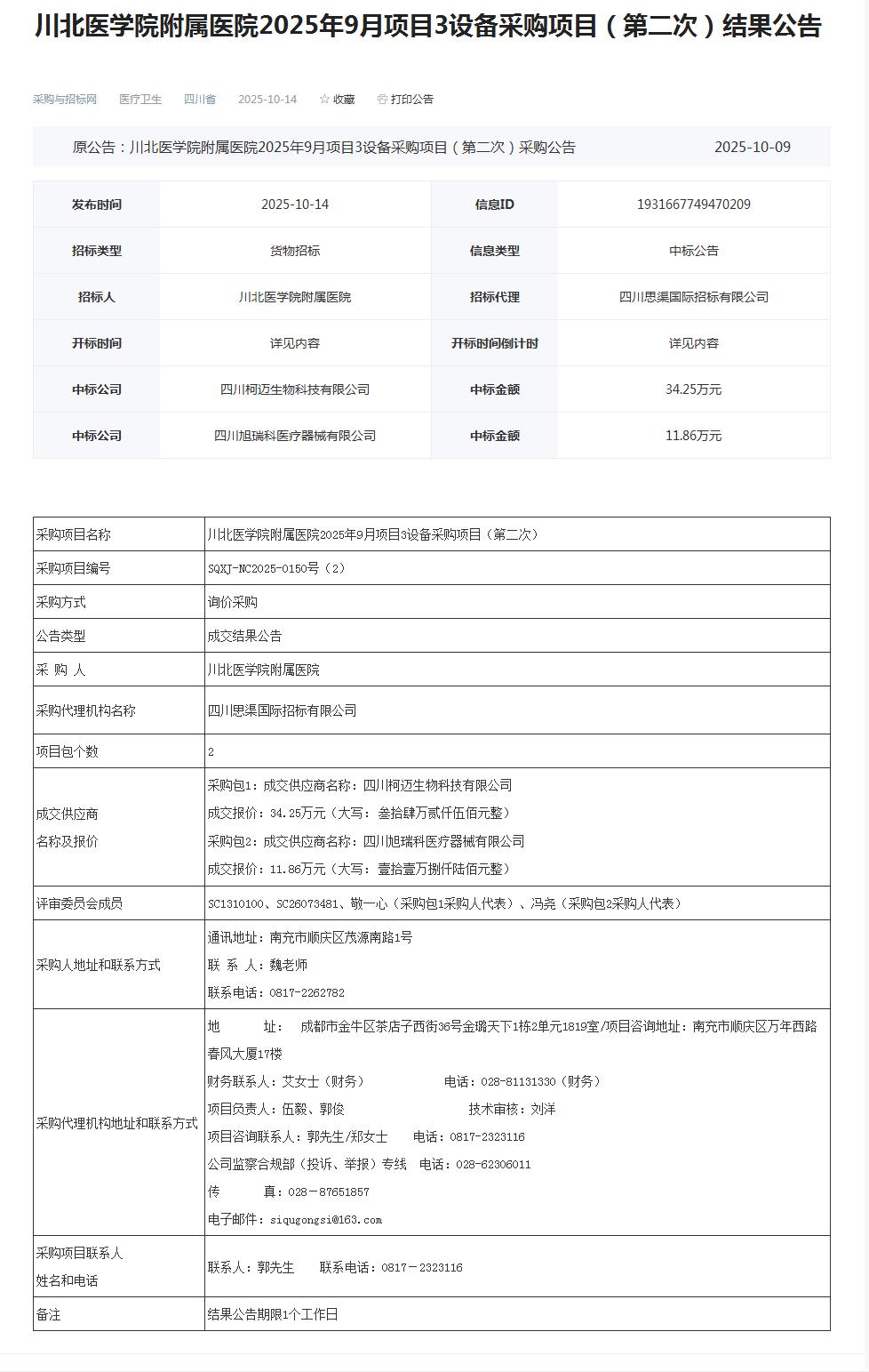 川北医学院附属医院2025年9月项目3设备采购项目(第二次)结果公告