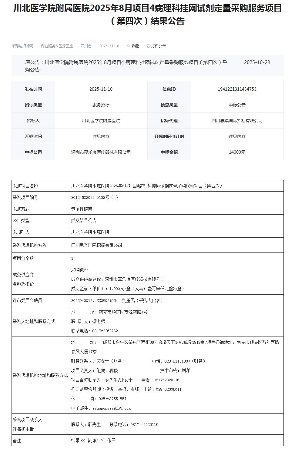 【结果】川北医学院附属医院2025年8月项目4病理科挂网试剂定量采购服务项目(第四次)采购结果公告