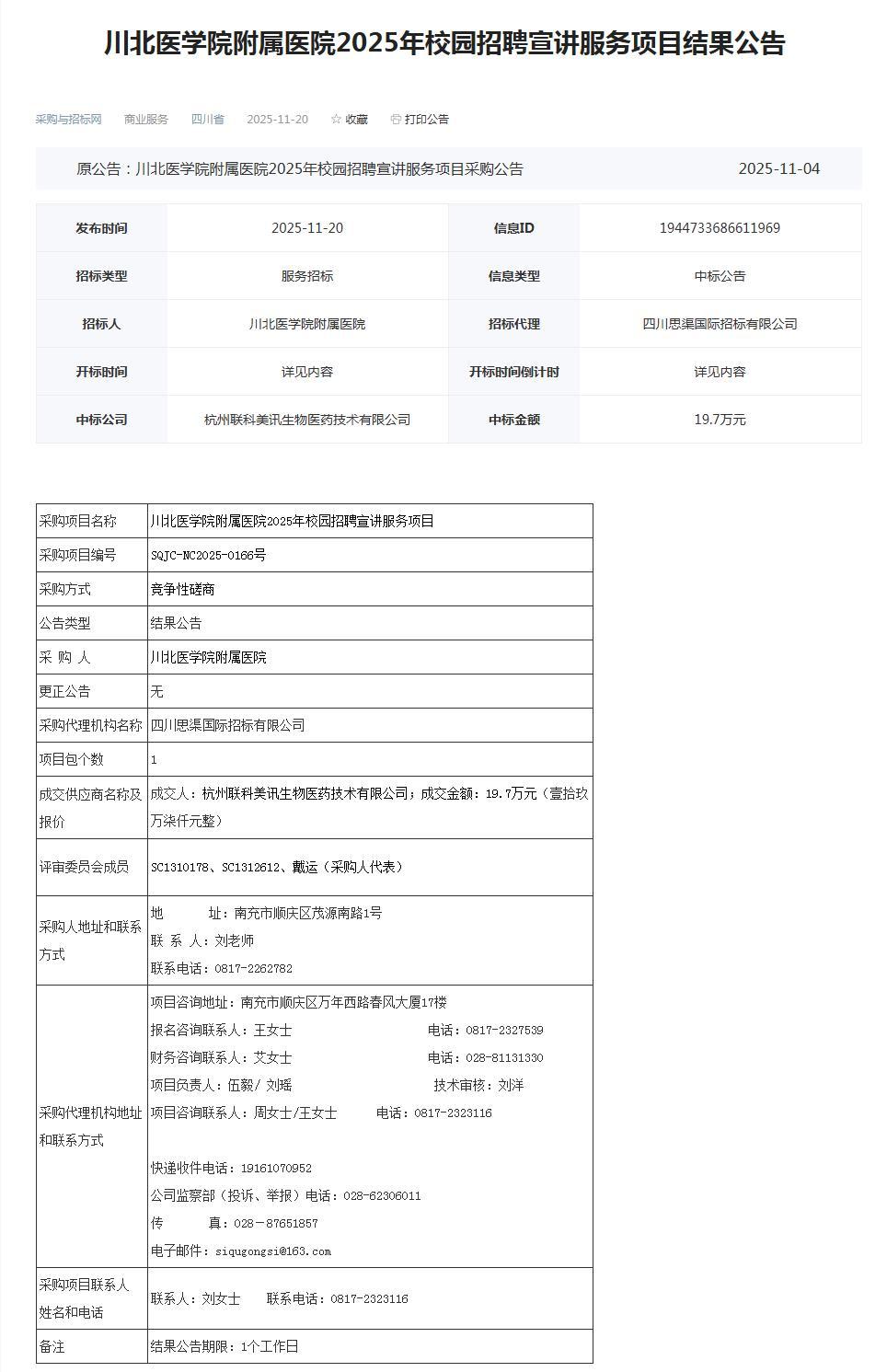 川北医学院附属医院2025年校园招聘宣讲服务项目结果公告
