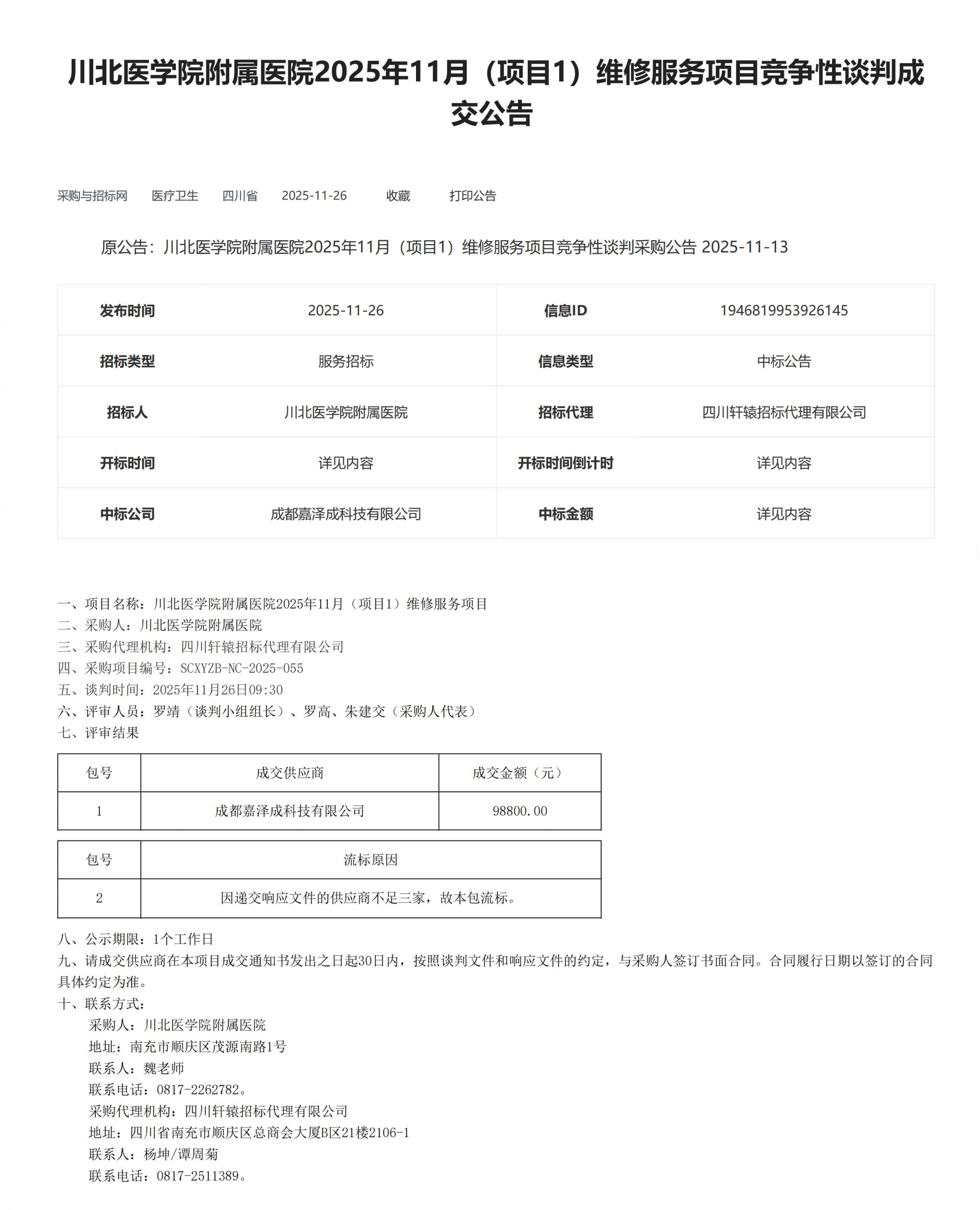 根据《中华人民共和国招标投标法》及医院招标采购制度相关规定,现将我院川北医学院附属医院2025年11月(项目1)维修服务项目竞争性谈判成交公告如下。也可登录中国采购与招标网(网址:http://www.chinabidding.cn/sa/sichuan/)