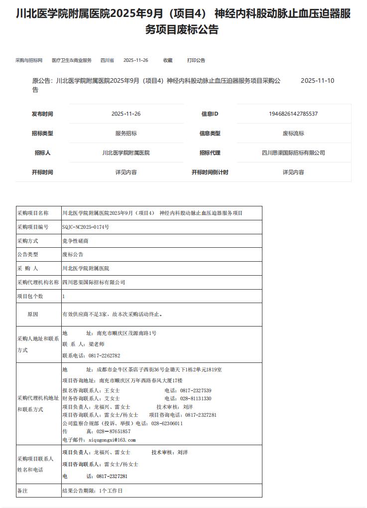 根据《中华人民共和国招标投标法》、《中华人民共和国政府采购法》及医院招标采购制度相关规定,现将我院2025年9月(项目4) 神经内科股动脉止血压迫器服务项目废标公告如下。也可登录中国采购与招标网(网址:http://www.chinabidding.cn/sa/sichuan/)查询详情。