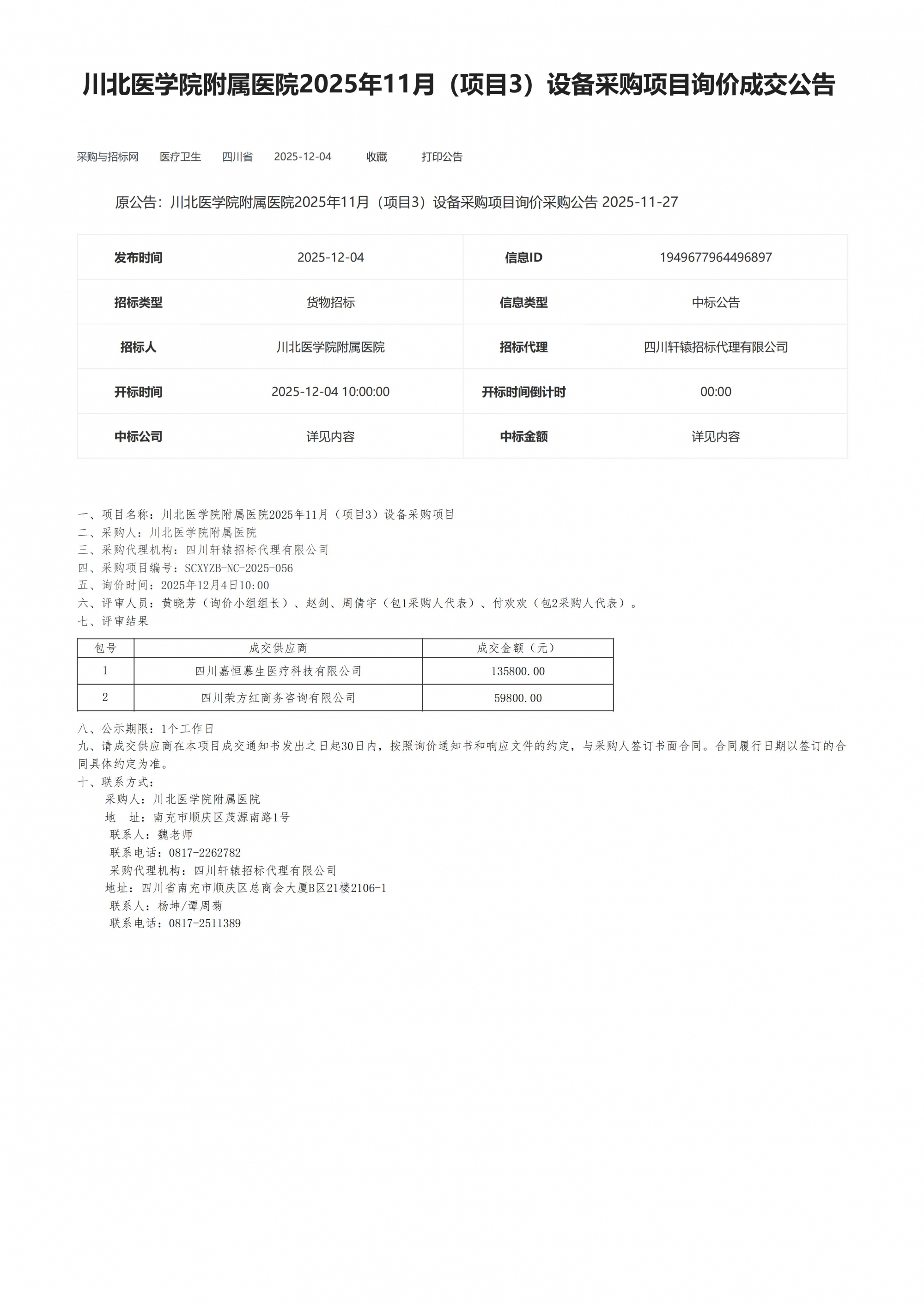 川北医学院附属医院2025年11月(项目3)设备采购项目询价成交公告