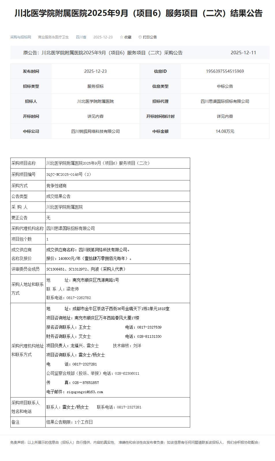 【结果】川北医学院附属医院2025年9月(项目6)服务项目(二次)结果公告