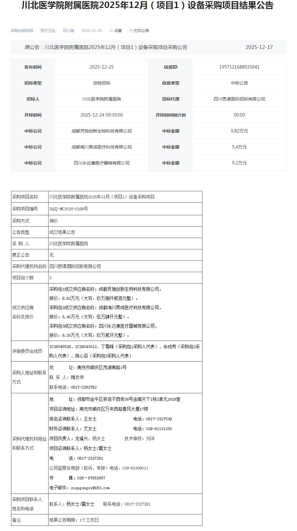 根据《中华人民共和国招标投标法》、《中华人民共和国政府采购法》及医院招标采购制度相关规定,现将我院2025年12月(项目1) 设备采购项目结果公告如下。也可登录中国采购与招标网(网址:http://www.chinabidding.cn/sa/sichuan/)查询详情