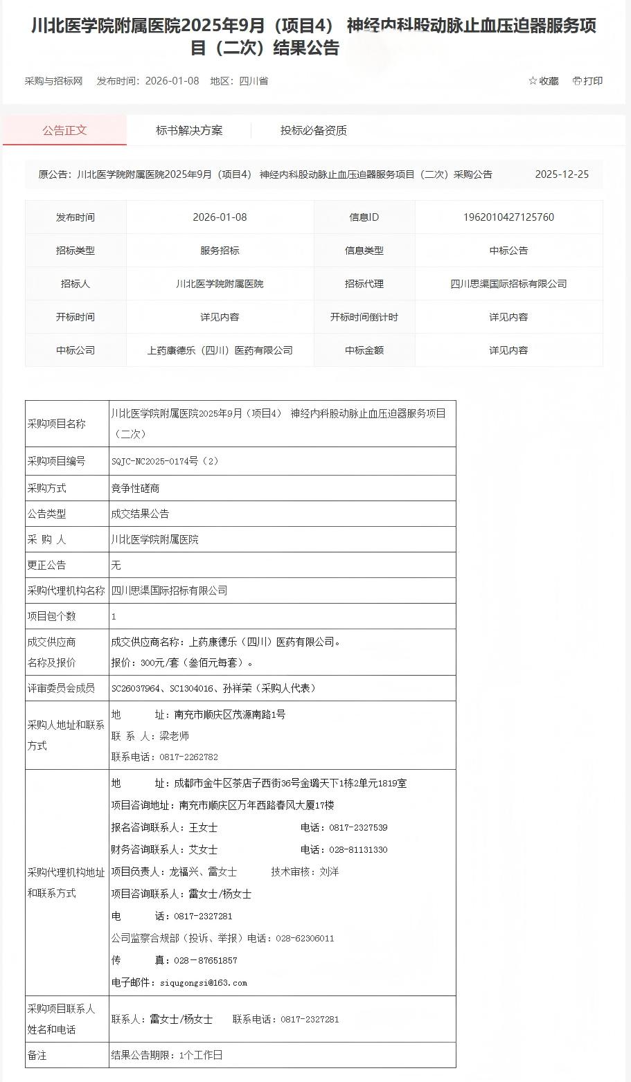 【结果】川北医学院附属医院2025年9月(项目4)神经内科股动脉止血压迫器服务项 目(二次)结果公告