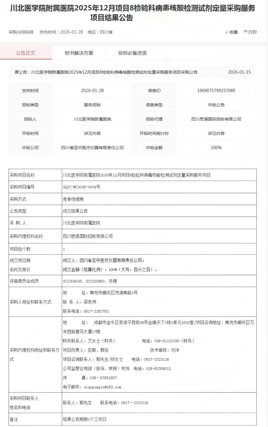 根据《中华人民共和国招标投标法》、《中华人民共和国政府采购法》及医院招标采购制度相关规定,现将我院2025年12月项目8检验科病毒核酸检测试剂定量采购结果公告如下。也可登录中国采购与招标网(网址:http://www.chinabidding.cn/sa/sichuan/)查询详情。