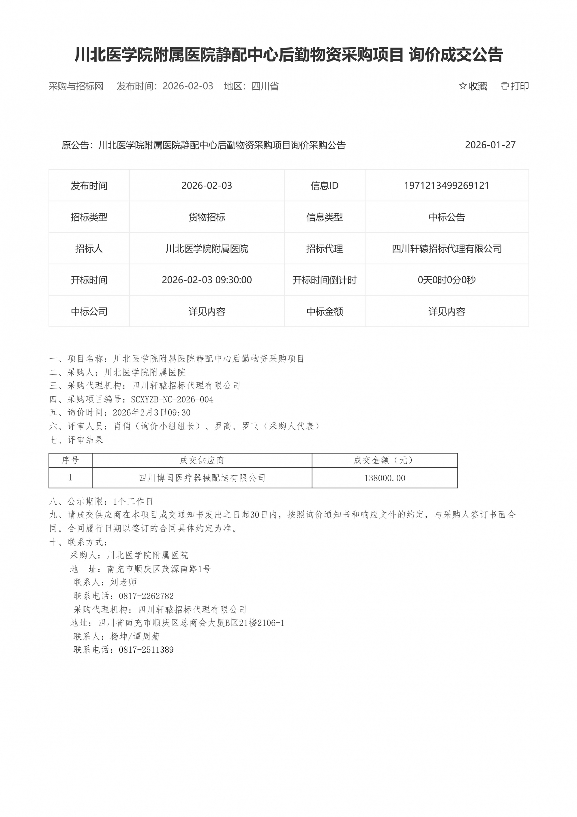 川北医学院附属医院静配中心后勤物资采购项目询价成交公告