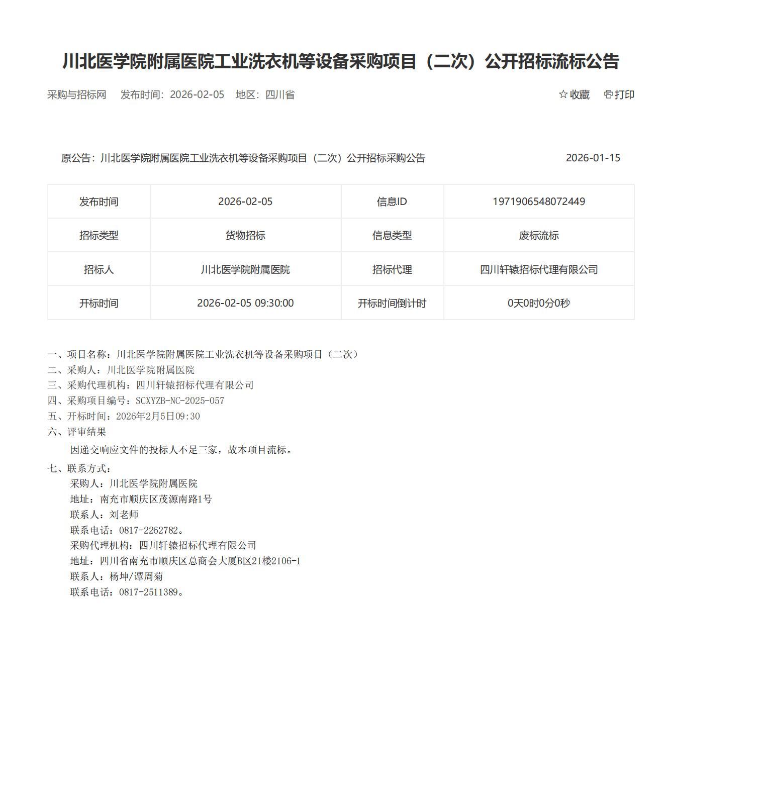 根据《中华人民共和国招标投标法》及医院招标采购制度相关规定,现将我院川北医学院附属医院工业洗衣机等设备采购项目(二次)公开招标流标公告如下。也可登录中国采购与招标网(网址:http://www.chinabidding.cn/sa/sichuan/)查询详情。