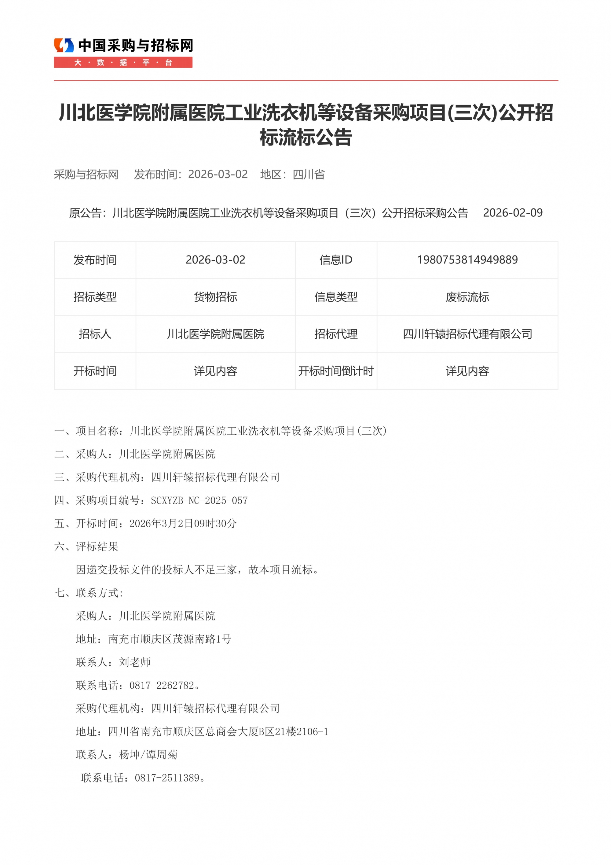 根据《中华人民共和国招标投标法》及医院招标采购制度相关规定,现将我院川北医学院附属医院工业洗衣机等设备采购项目(三次)公开招标流标公告如下。也可登录中国采购与招标网(网址:http://www.chinabidding.cn/sa/sichuan/)查询详情。