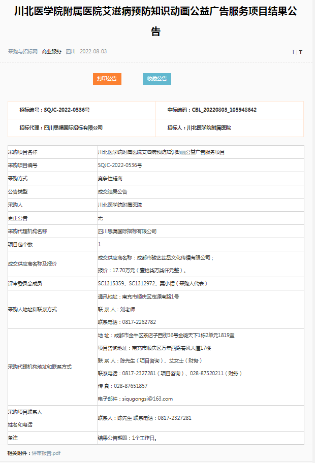 根据《中华人民共和国招标投标法》相关规定,现将我院川北医学院附属医院艾滋病预防知识动画公益广告服务项目结果公告如下。也可登录中国采购与招标网(网址:http://www.chinabidding.cn/sa/sichuan/)查询详情。