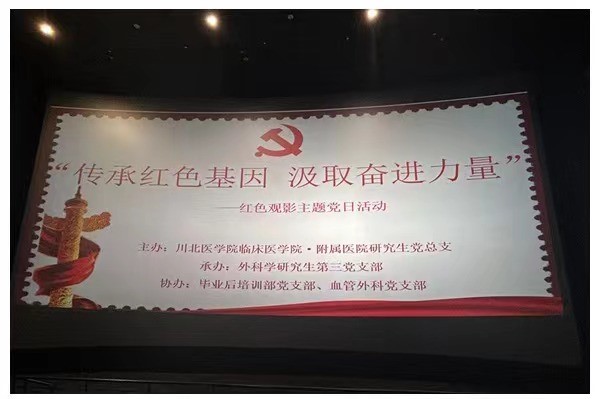 为深入学习贯彻党的二十大精神,进一步引导青年党员致敬英烈、铭记历史、传承红色基因、弘扬爱国情怀,11月18日,200余名党员参与了由川北医学院临床医学院·附属医院研究生党总支部主办、外科学研究生第三党支部承办、毕业后培训党支部及血管外科党支部协办的“传承红色基因 汲取奋进力量”红色观影主题党日活动。