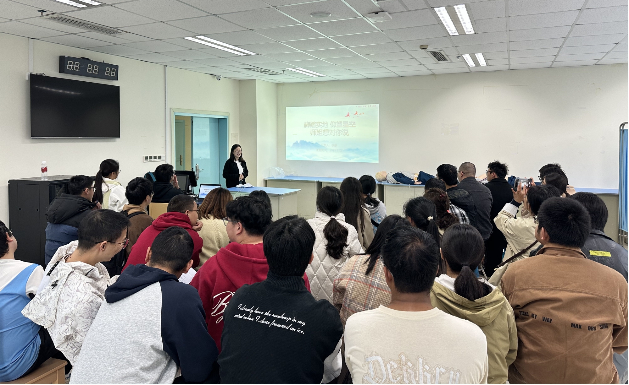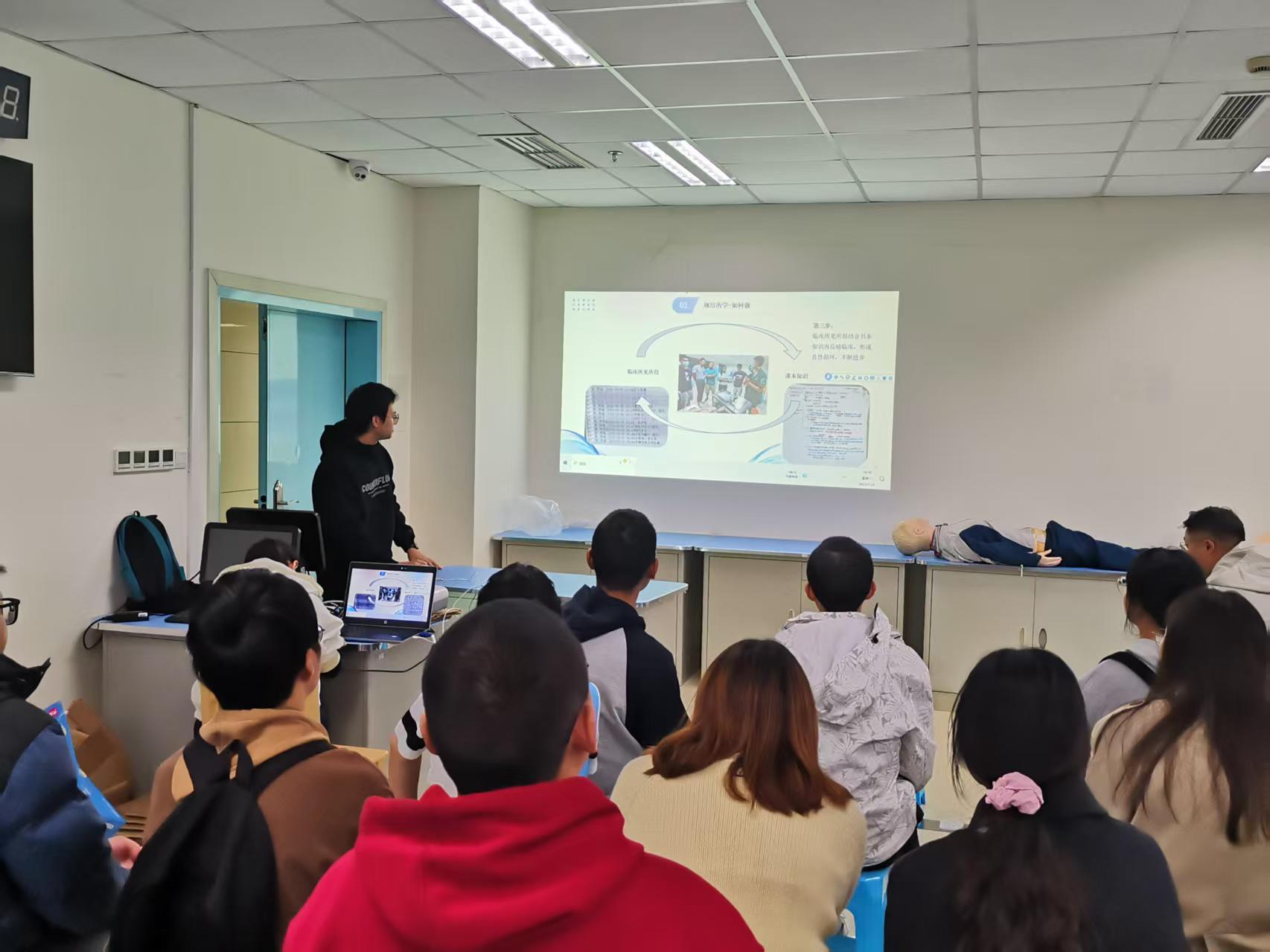 随后,2021级住培学员周小龙(现已成为当地卫生院的消化科主任)以“扎实求稳、垒实基础、不断进步”为主题,分享了从课堂到临床、从被动学习到主动思考的进阶路径。他强调把小事做细做实:病历书写、查体、医嘱落实与随手笔记一个不落;同时通过认真参加查房、参与教学讨论,在团队交流中打磨临床思维。在方法论上,他倡导“当日反思、阶段复盘”,以“课本—临床—再反哺临床”的闭环提升能力。他举例心内科教学查房中的追问——“急性心肌梗死患者为何将心率控制在约60次/分”——提醒大家将生理机制、循证证据与个体化决策贯通起来。他反复提示“基本功第一重要、规范意识同样重要”,并强调把安全与医疗质量置于高强度临床节奏之前。
